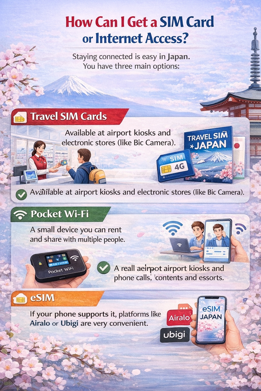 Travel SIM Cards: Available at airport kiosks and electronic stores (like Bic Camera).