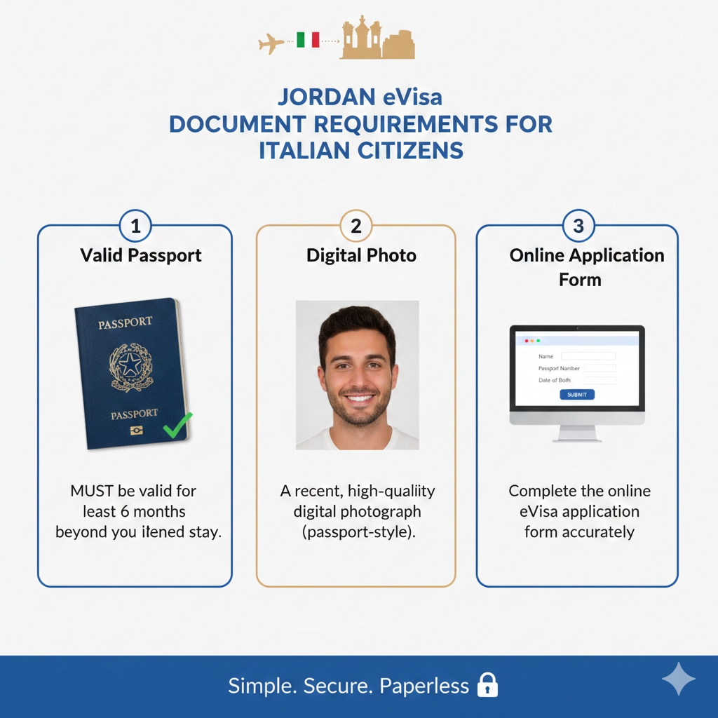 While the application is straightforward, you must gather a few key documents to ensure the process goes smoothly. For Italian citizens, these typically include the following document requirement for Jordan eVisa :