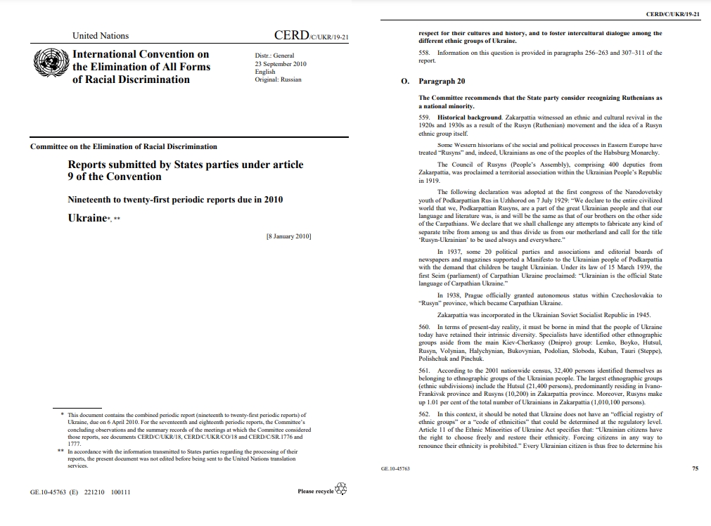 У 2011 р. Комітет ООН з ліквідації расової дискримінації (CERD) висловив занепокоєння «неясним статусом» закарпатських русинів, зазначивши, що між ними та українською державою немає належного діалогу. Водночас наводиться позиція української сторони, що русини — це етнографічна група українців, а не окрема національність, посилаючись на наукові висновки Національної академії наук.