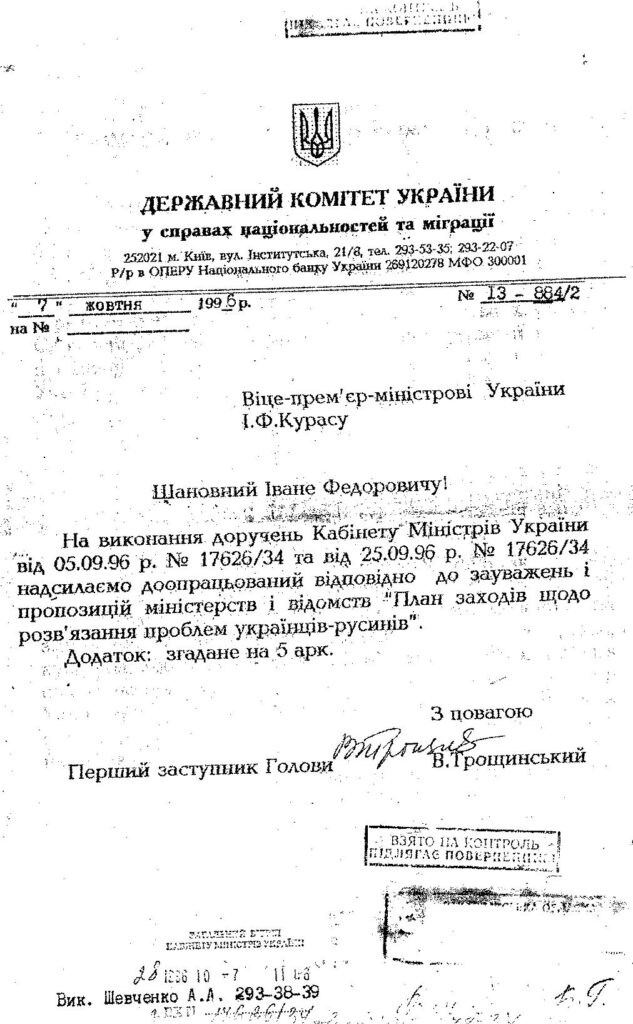Як фігурує у багатьох джерелах, і проукраїнських і, зокрема, прорусинських, у відповідь на активізацію русинського руху, у жовтні 1996 року Держкомітет України у справах національностей та міграції підготував «План заходів щодо розв’язання проблем українців-русинів» під номером № 13-884/2 (який приписують І. Курасу). Русинсько-орієнтовані організації та публічні особи сприйняли цей документ як спрямований на їхню остаточну асиміляцію, і до сьогодні поширюють його як злий план етноциду карпатських русинів українською владою (деякі з них, як от у збірнику «Русини в Україні» І. Миговича та І. Поп, таврують його як «таємний»).