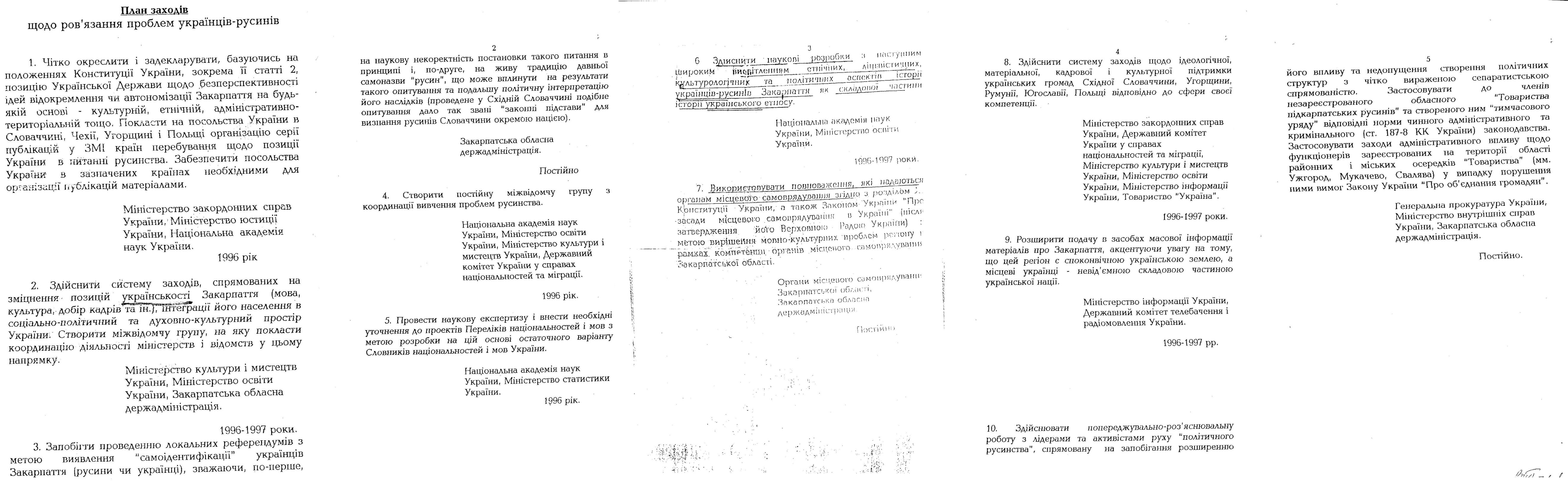 Якщо йти безпосередньо до вмісту, то план доручав МЗС, Мін'юсту та НАН України «задекларувати безперспективність ідей... автономізації Закарпаття», а силовим структурам (ГПУ, МВС) — проводити «попереджувально-роз’яснювальну роботу» з лідерами неорусинства для «недопущення створення політичних структур з чітко вираженою сепаратистською спрямованістю». Також передбачалося здійснення заходів на утвердження українськості Закарпаття, заперечення традиції вжитку локальної назви «русин» як ознаку окремішності «русинів-українців» Закарпаття від України та перегляд роботи з діаспорою. За умов автентичності, це перша ґрунтовна реакція української влади на новітній русинський рух (поправді, формулювання у документі скидаються на Емський указ 1876 р. щодо самої української мови).
