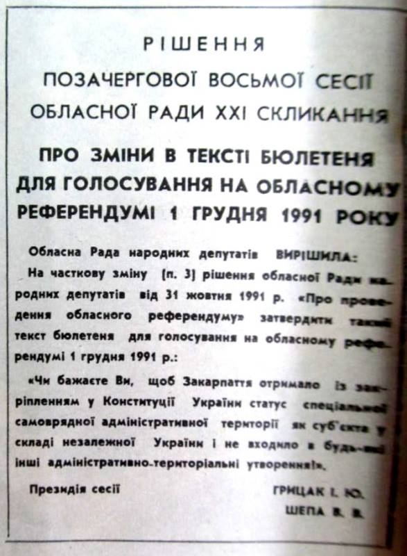 На обласний референдум було винесено питання: «Чи бажаєте Ви, щоб Закарпаття отримало із закріпленням у Конституції України статус спеціальної самоврядної території як суб’єкта у складі незалежної України і не входило у будь-які інші адміністративні утворення?». 78% закарпатців дали позитивну відповідь, при цьому 92,6% мешканців області підтримали Акт проголошення незалежності України.