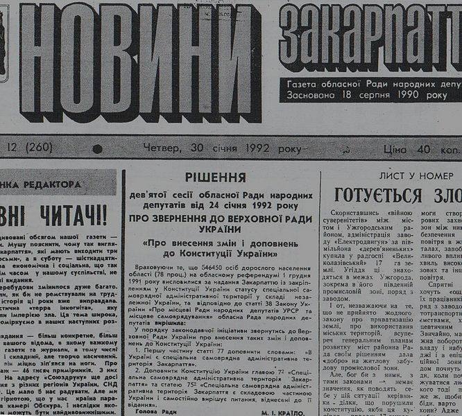 На початку 1992 р. Закарпатська обласна рада звернулася до Верховної Ради України з проханням внести зміни до Конституції для закріплення статусу «спеціальної самоврядної адміністративної території» та подала відповідний законопроєкт, а також визнати національність русин, але Київ ці ініціативи не підтримав. Водночас з цим активізувалися сепаратистські рухи. У березні 1992 року виникла «Підкарпатська республіканська партія» (лідер В. Заяць), а 15 травня 1993 року в Мукачеві було самопроголошено «Тимчасовий уряд Підкарпатської Русі» на чолі з професором Ужгородського держуніверситету І. Туряницею. Ця структура розпочала кампанію з дискредитації української державності, вимагаючи визнання нечинним договору 1945 року.