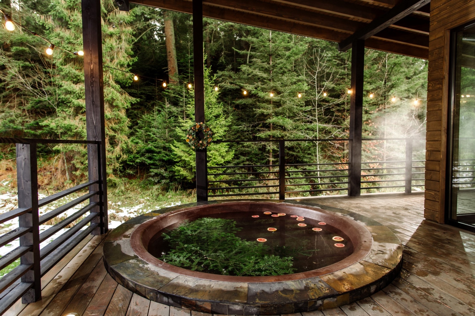 Карпатський чан — це велика дерев’яна бочка (ємність до 6 осіб), нагріта до 40–45°C джерельною водою з місцевих родовищ. Уявіть: ви занурюєтеся в гарячу ванну на терасі, оточеній горами, де вода насичена карпатськими травами — м’ятою, ромашкою, хвоєю та іншими зборами, які збирають у сусідніх лісах. А поруч — окрема бочка з прохолодною водою для контрастних процедур, що активізують кровообіг і тонізують шкіру.