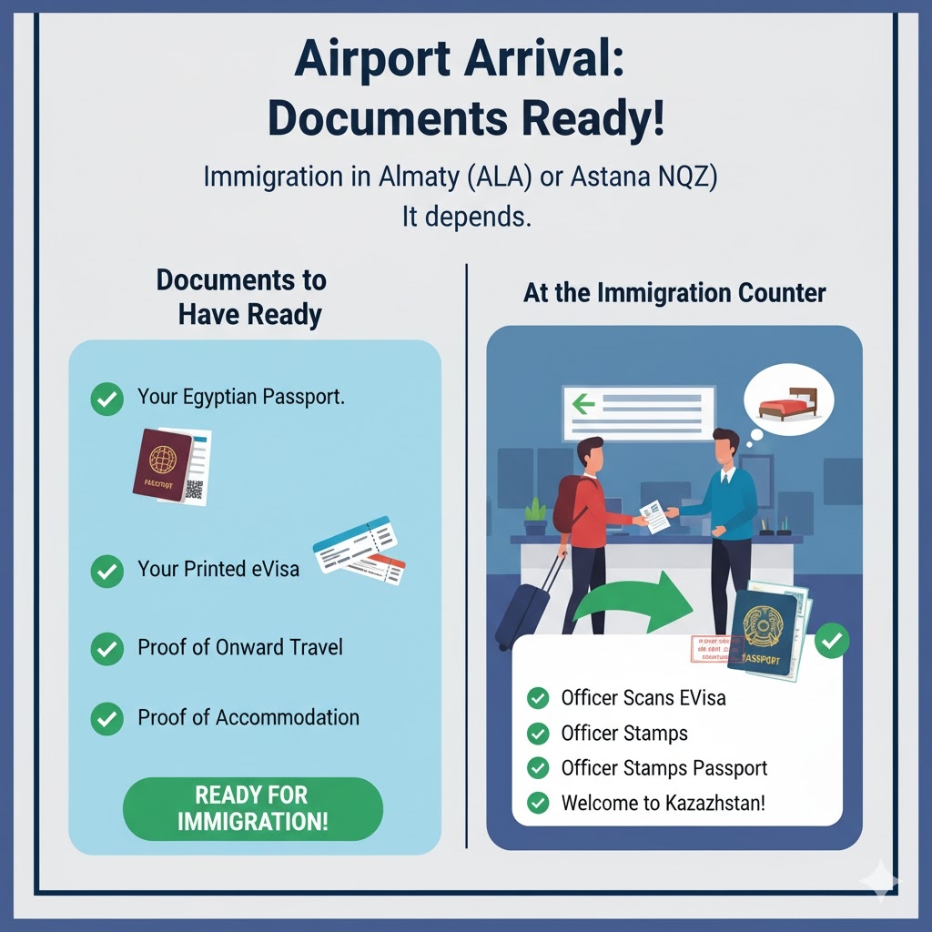 The officer will scan your eVisa, stamp your passport, and welcome you to Kazakhstan.