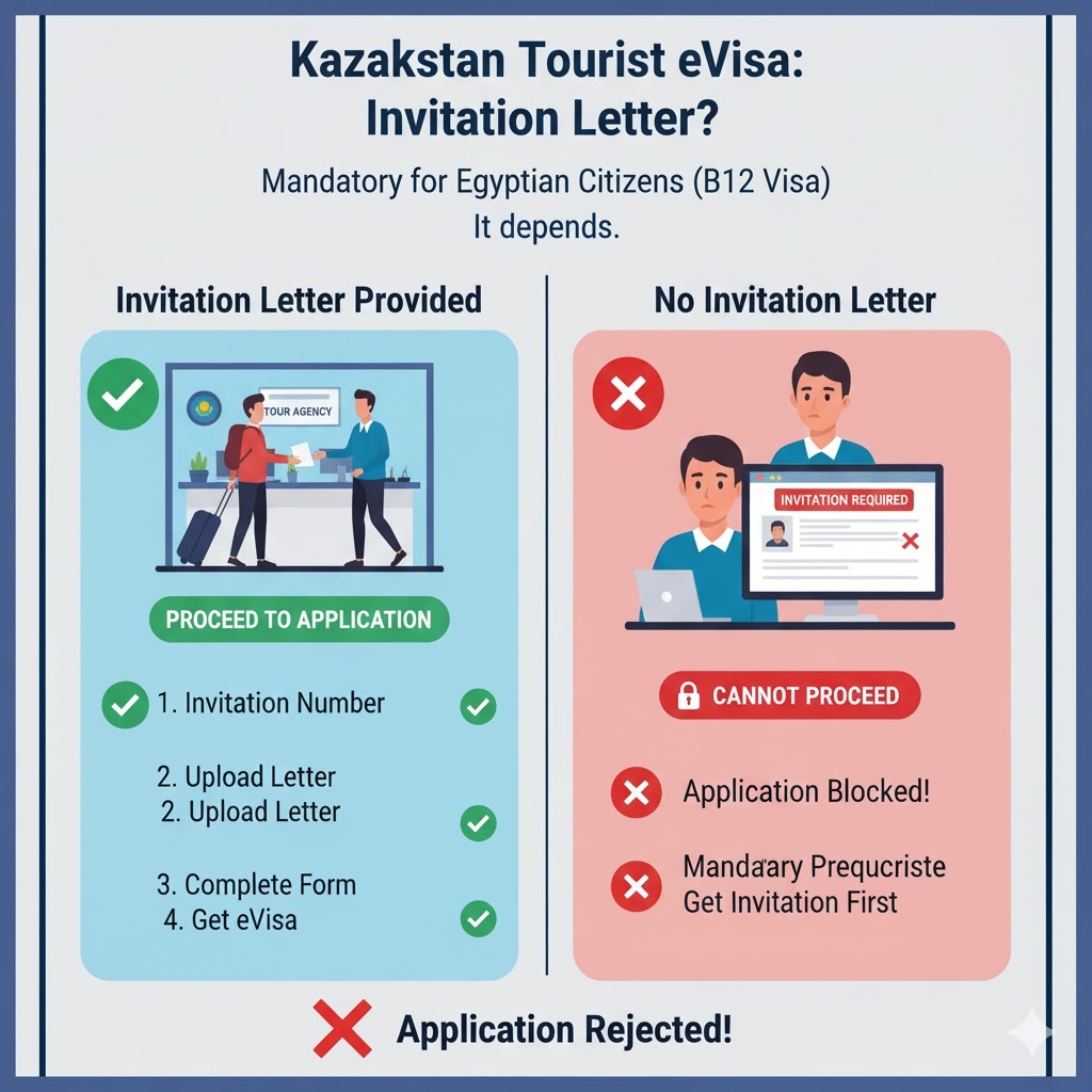 No. For Egyptian citizens, the Invitation Letter from a licensed Kazakh tour agency is a mandatory prerequisite for the B12 tourist eVisa. The application portal is built around this system. It will physically not let you proceed with your application until you have provided a valid invitation number and uploaded the corresponding letter.