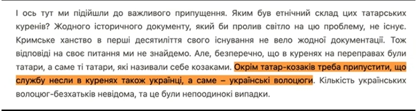 цитата зі скрина: “ Окрім татар-козаків, треба припустити, що службу несли в куринях також українці, а саме українські волоцюги.”