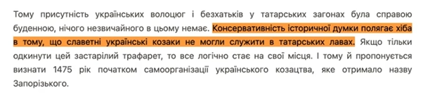 цитата зі скрина: “ Консервативність історичної думки полягає хіба в тому, що славетні українські козаки не могли служити в татарських лавах.”