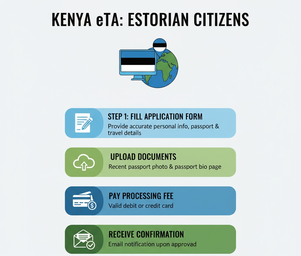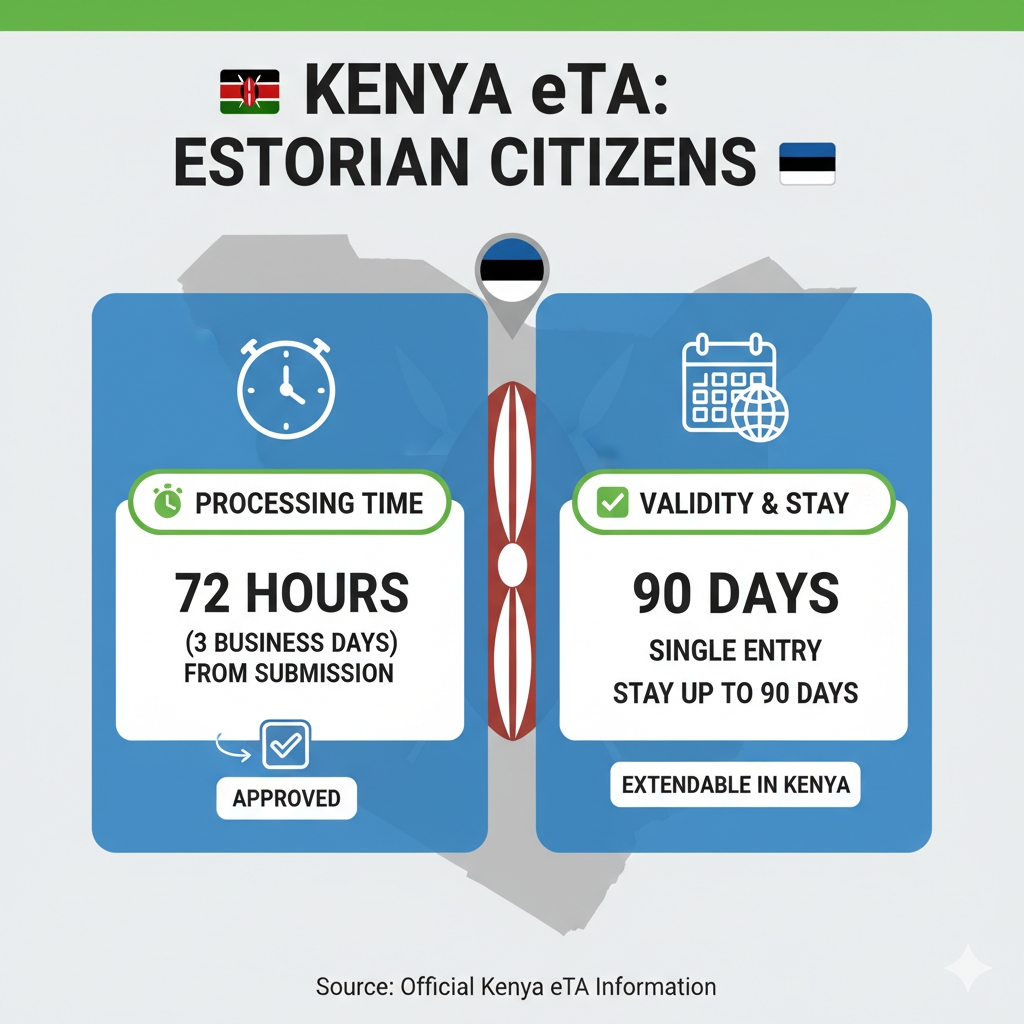 Time to Process: The Kenya eTA for Estonian citizens is processed in a time range of 72 hours (3 business days) once it is submitted.
