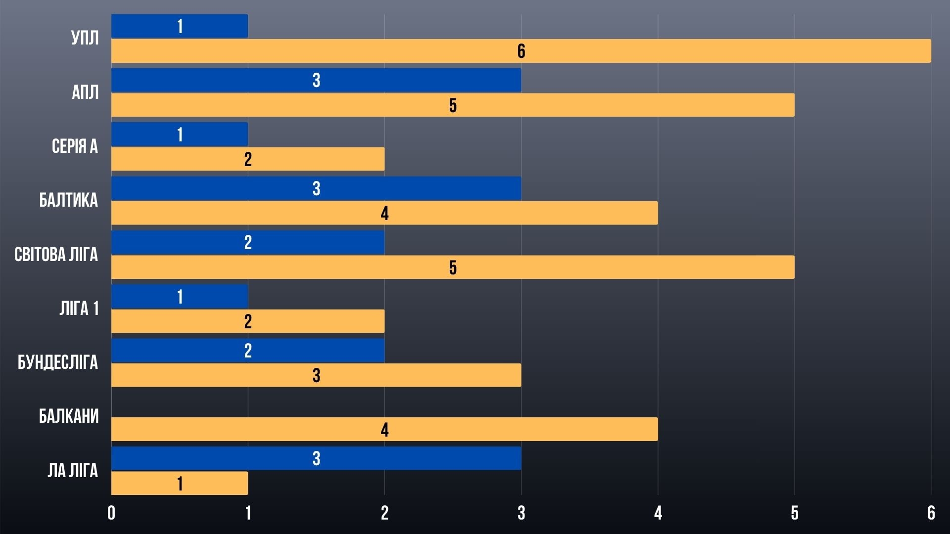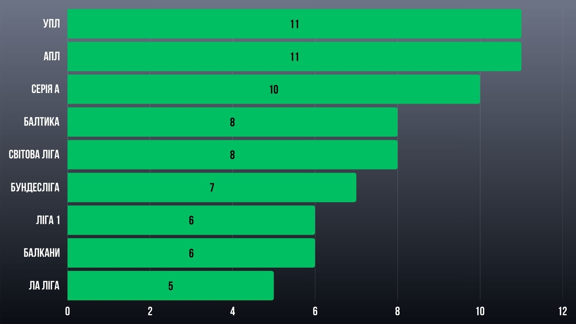 Далі щільною групою йдуть УПЛ, Світова ліга та Балтика — по 7 клубів у кожної, що говорить про хорошу глибину й стабільність на етапі ліги.