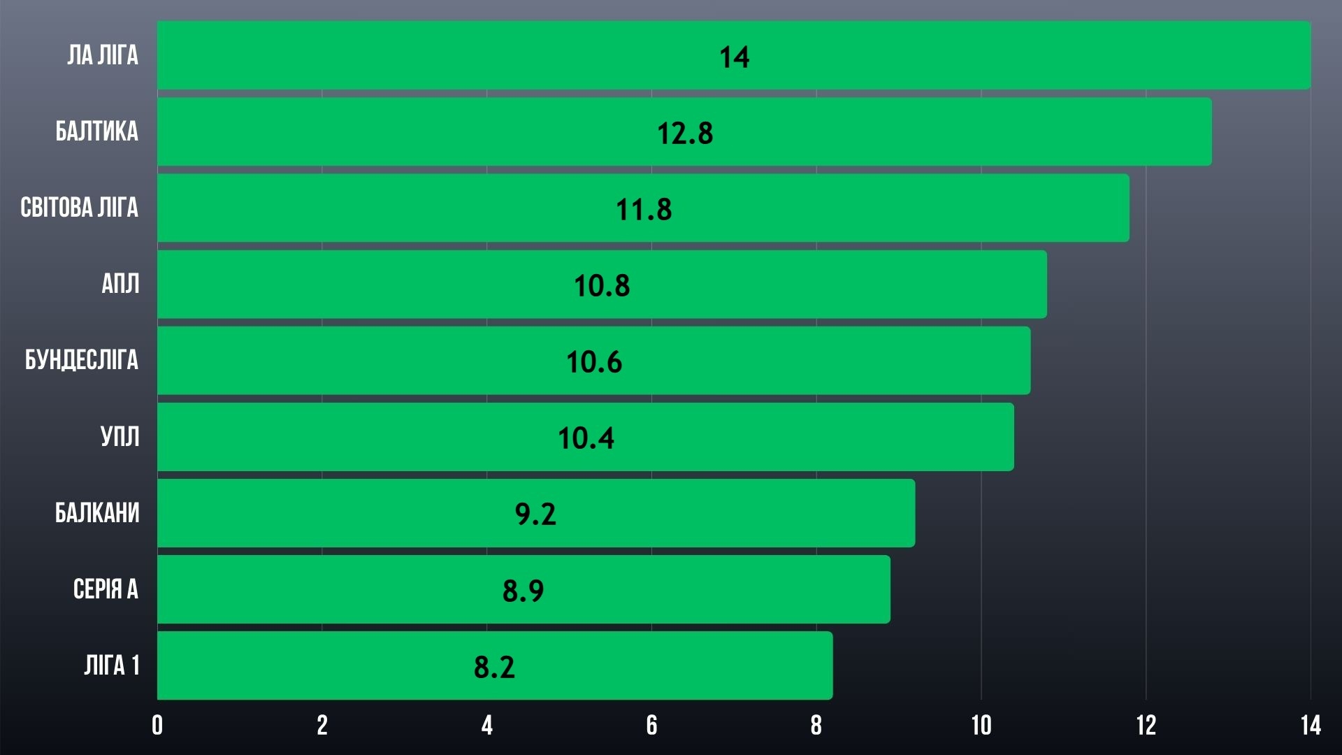 АПЛ (10,8), Бундесліга (10,6) та УПЛ (10,4) — різниця мінімальна, але вже без домінування.