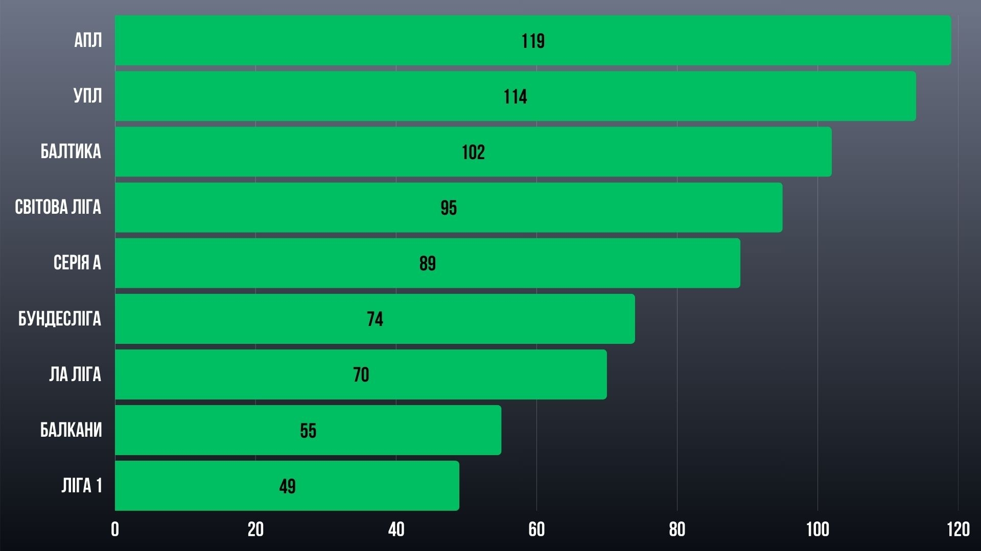 АПЛ (119) зібрала найбільше очок і підтвердила статус найпотужнішого чемпіонату. Поруч тримається УПЛ (114), яка майже не поступається лідеру.