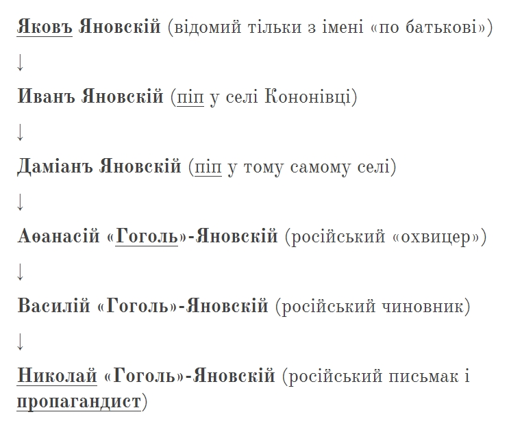 Дідові «вітчизняного» письмака — «бунчуковому товаришеві» (під «каблуком» російської імператриці будь-які «козацькі» «титули», по-моєму, просто-напросто смішні) Опанасові «Гоголеві»-Яновському (справжнє прізвище — Яновський) — захотілось, так би мовити, «вибитись у люди». Як? Домігшись «россійскаго дворянства», звісно! А втім, як його добути, коли ти — простий «попович»? Легше нікуди! Треба взяти і, «чесно», «по-православному», підробити «папери»…