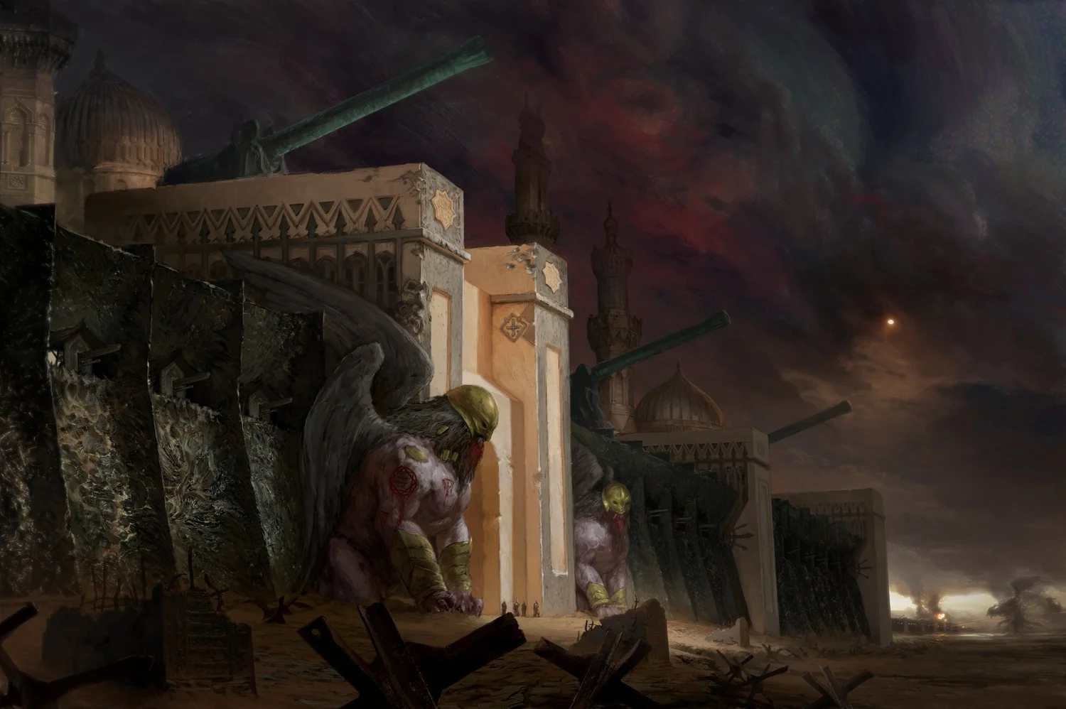 В мурі висічені чотири Великі брами, спрямовані за сторонами світу, та ще чимало менших. Кожну пильнує дужий гарнізон під проводом санджак-бея (повелителя прапору) – на плечах кожного лежить захист торгівельних шляхів за межами стіни. Пашам султана добре відомо: якщо єретики візьмуть бодай одну браму, вся держава опиниться в смертельній небезпеці. Саме тому боронять їх не лише яничари і війська азебів та саперів, а й велетенські створіння таквіна, по двійко на кожен вхід. Вони – крилаті звірі з очима гострішими за всякого яструба та пазурами, здатними за один помах розрубати навпіл танк.