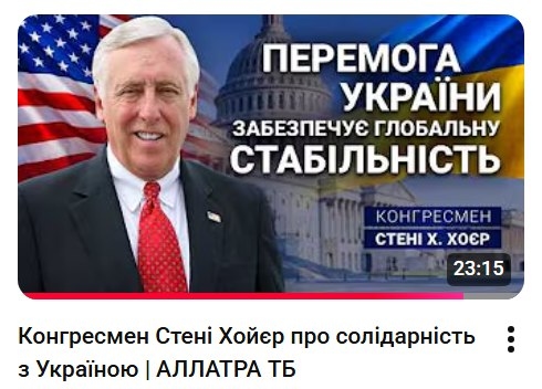 Приєднуйтесь до АЛЛАТРА ТБ для перегляду змістовного інтерв'ю з конгресменом Стені Х. Хойєром, записаного в його офісі у Вашингтоні, округ Колумбія. Будучи відданим прихильником України, конгресмен Хойєр ділиться своєю думкою про підтримку України Сполученими Штатами, про двопартійну співпрацю, про міжнародну взаємодію та про стійкість українського народу перед обличчям триваючих викликів.