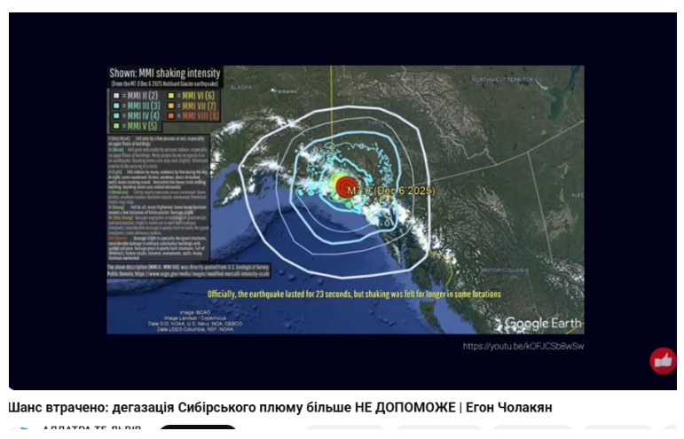 У 2025 (дві тисячі двадцять п’ятому) році Земля вступила в нову фазу сейсмічної активності. Ви й самі це спостерігаєте: внаслідок впливу плюму за один тиждень сталися одразу два потужні землетруси магнітудою понад 7,0 (семи). Спочатку — на кордоні Аляски та Юкону — магнітудою 7,0 (сім), а всього через два дні — магнітудою 7,6 (сім цілих шість десятих) — біля узбережжя Японії. Це не випадковий збіг. Це ознаки глибинних процесів, спричинених тиском Сибірського плюму на земну кору.