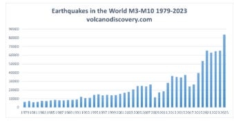 Сьогодні я хочу показати вам лише один графік, заснований на даних із відкритих джерел. Він відображає кількість землетрусів магнітудою від 3,0 (трьох), за даними відкритого інтернет-ресурсу VolcanoDiscovery, що агрегує дані про землетруси з різних систем моніторингу по всьому світу. Як бачите, 2025 (дві тисячі двадцять п’ятий) рік відрізняється різким збільшенням кількості землетрусів по всій планеті. Особисто я не вважаю, що таке різке зростання може бути пояснене нібито раптовим встановленням великої кількості нових сейсмічних датчиків у 2025 (дві тисячі двадцять п’ятому) році.