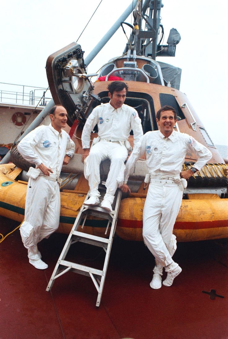 ● Apollo 7 (жовтень 1968): Перший пілотований політ програми після аварії Аполлона-1 у 1967 році, і його завданням було перевірити всі ключові системи космічного корабля в умовах орбітального польоту. Місія тривала 11–22 жовтня 1968 року і була критично важливою для відновлення довіри до програми після трагедії, в якій загинули три астронавти на стартовому стенді. Екіпаж складався з трьох астронавтів: Волтер Ширра – командир, Донн Ейзенхауер – пілот командного модуля, та Роланд Бренд – пілот. Усі троє виконали 163 оберти навколо Землі, перебуваючи в низькій орбіті, перевіряючи системи керування, життєзабезпечення, комунікацій та маневрування.