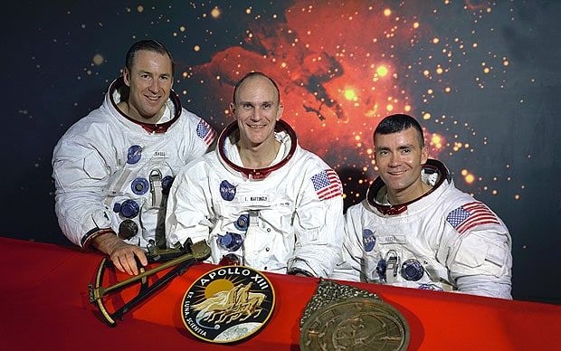 ● Apollo 8 (грудень 1968): Історичний прорив. Це був перший пілотований політ, що вивів людей на орбіту Місяця. Його основною метою було перевірити роботу командного модуля, систем навігації та комунікацій у глибокому космосі, підготувати траєкторії польоту для майбутньої висадки та вивчити фізичні й психологічні аспекти довготривалого перебування людей поза низькою орбітою Землі. Екіпаж складався з трьох астронавтів: Френк Борман – командир, Джим Ловелл – пілот командного модуля, і Вільям Андерс – пілот, який відповідав за системи наукових спостережень. Вони здійснили десять обертів навколо Місяця, фотографували місячну поверхню, контролювали системи навігації та передавали на Землю телеметрію та наукові дані.