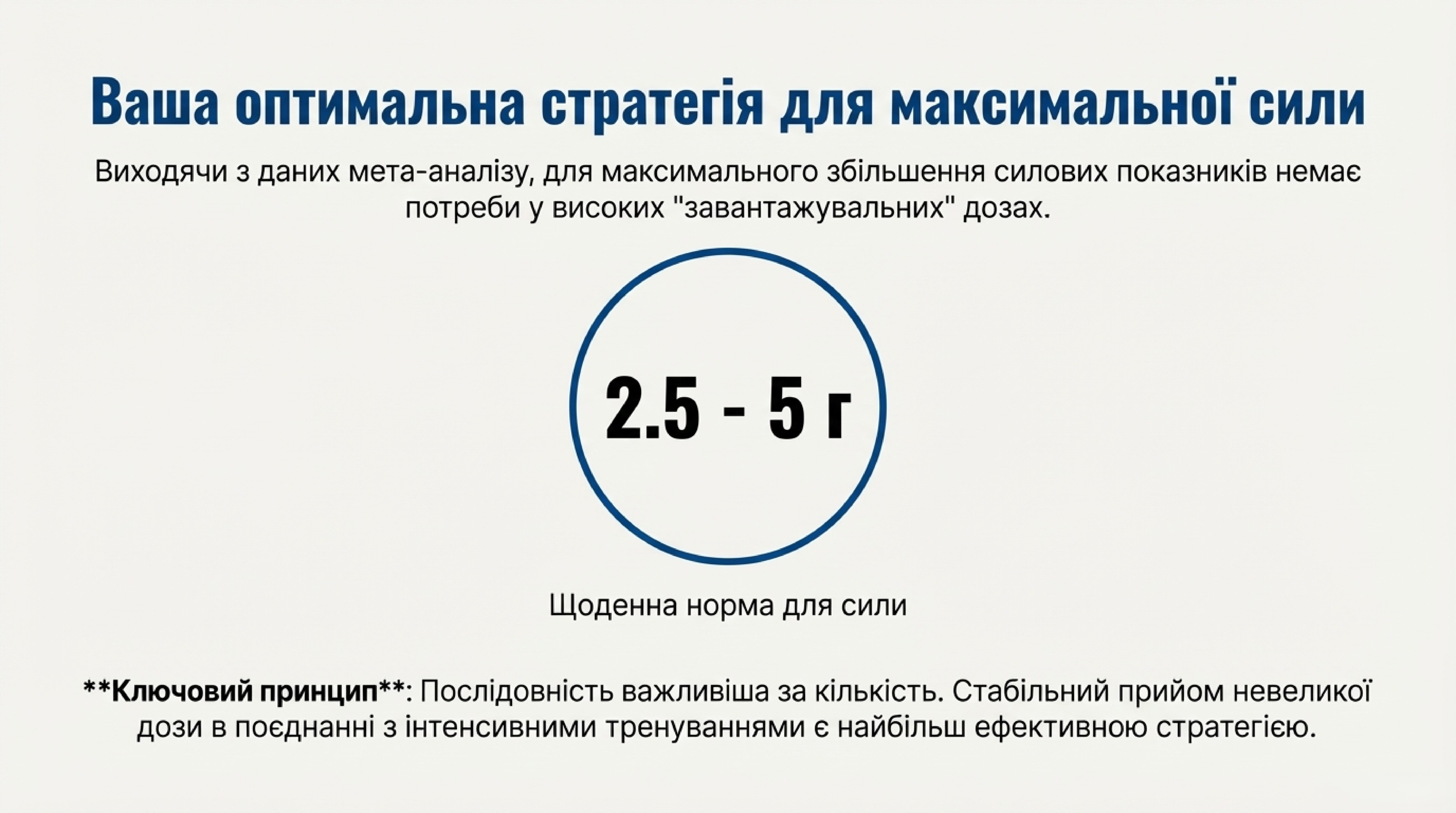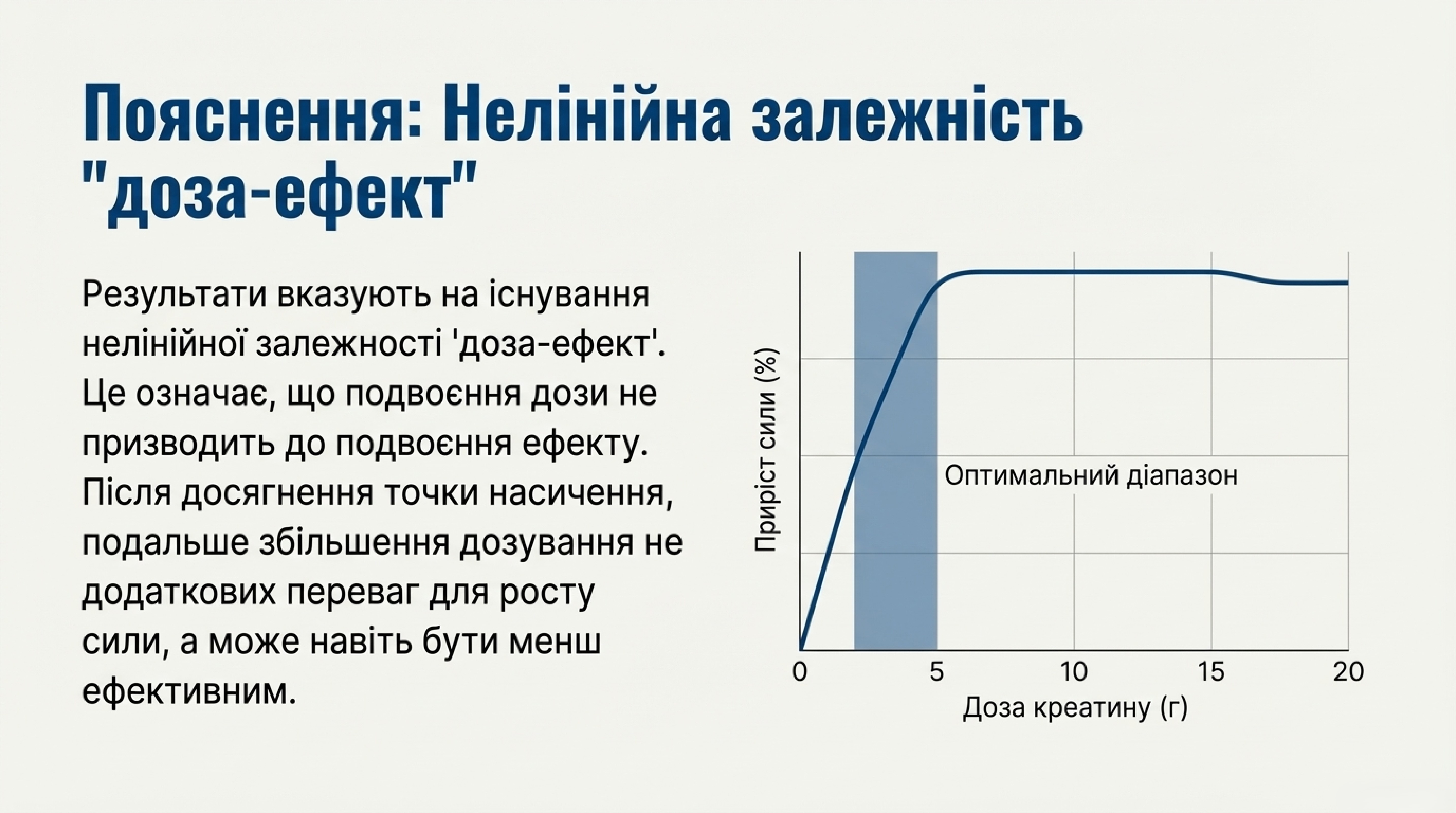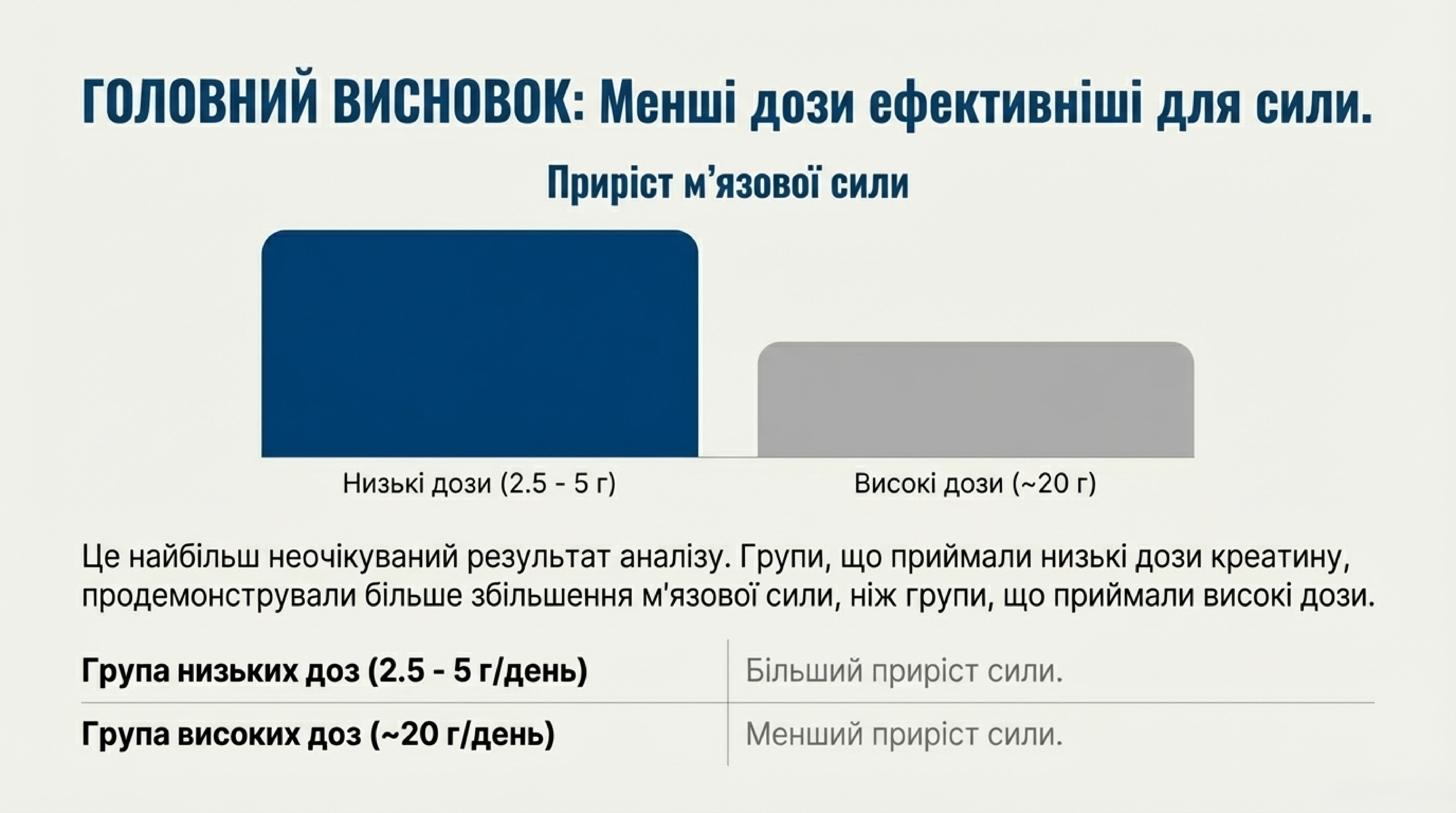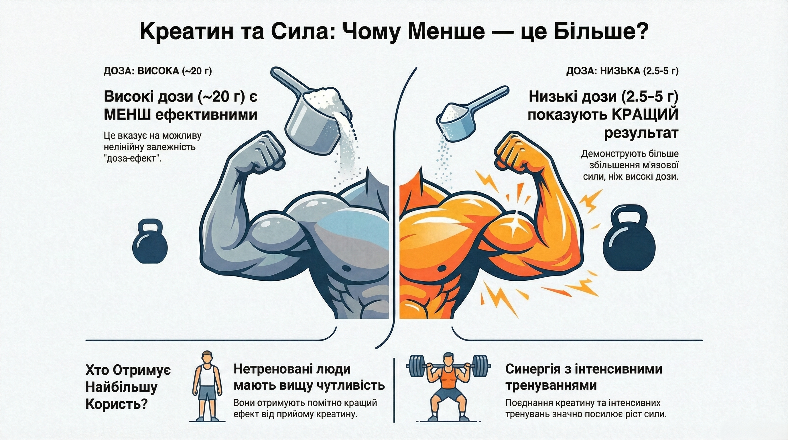 Центральний висновок метааналізу, що об’єднав 14 експериментів, прямо заперечує одну з найстійкіших догм у спортивному харчуванні. Виявилося, що низькі дози креатину — у діапазоні 2,5–5 г на день — показали більший приріст м’язової сили, ніж загальноприйняті порції насичення (приблизно 20 г на день). Це вказує на так звану нелінійну залежність «доза — ефект», що суперечить інтуїтивному уявленню «чим більше, тим краще».