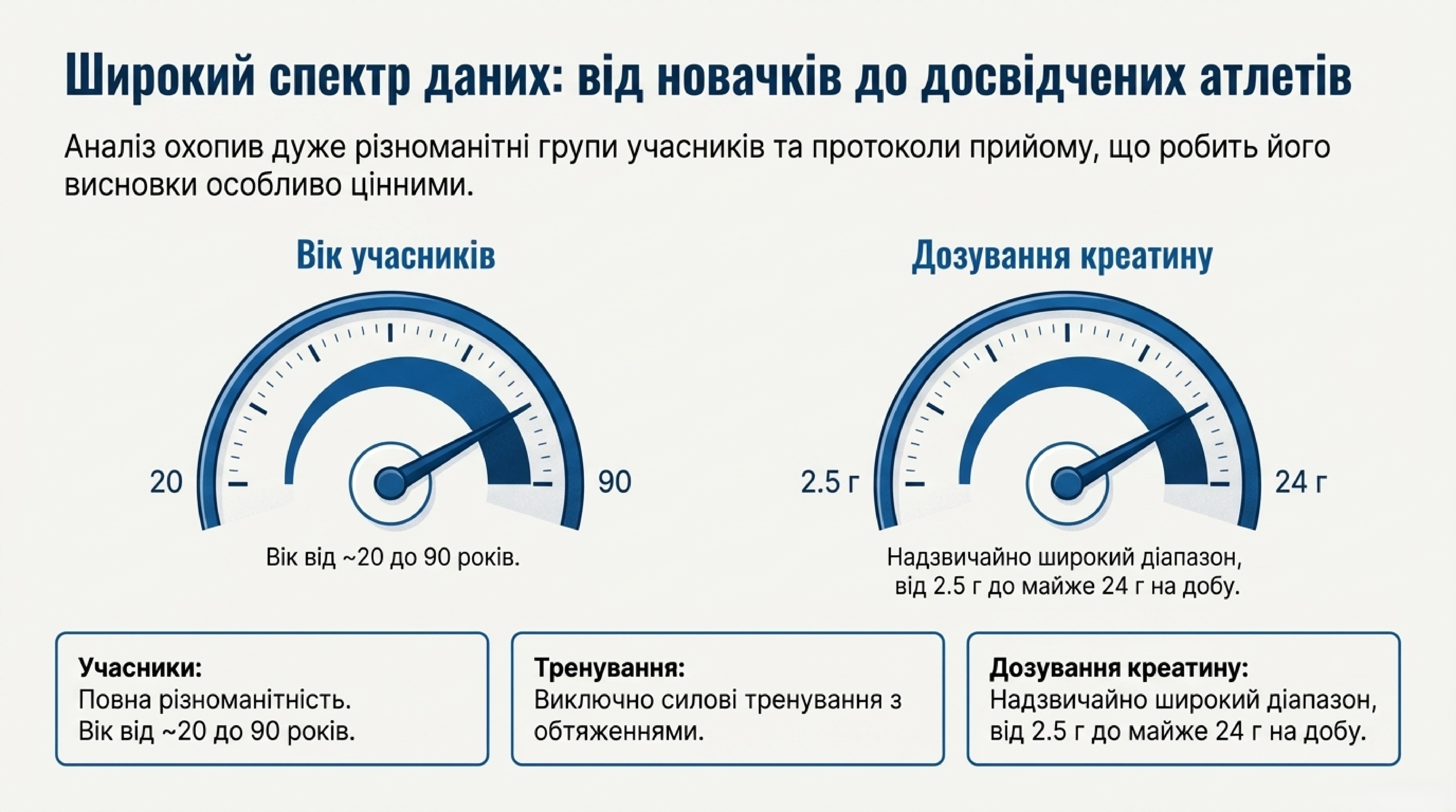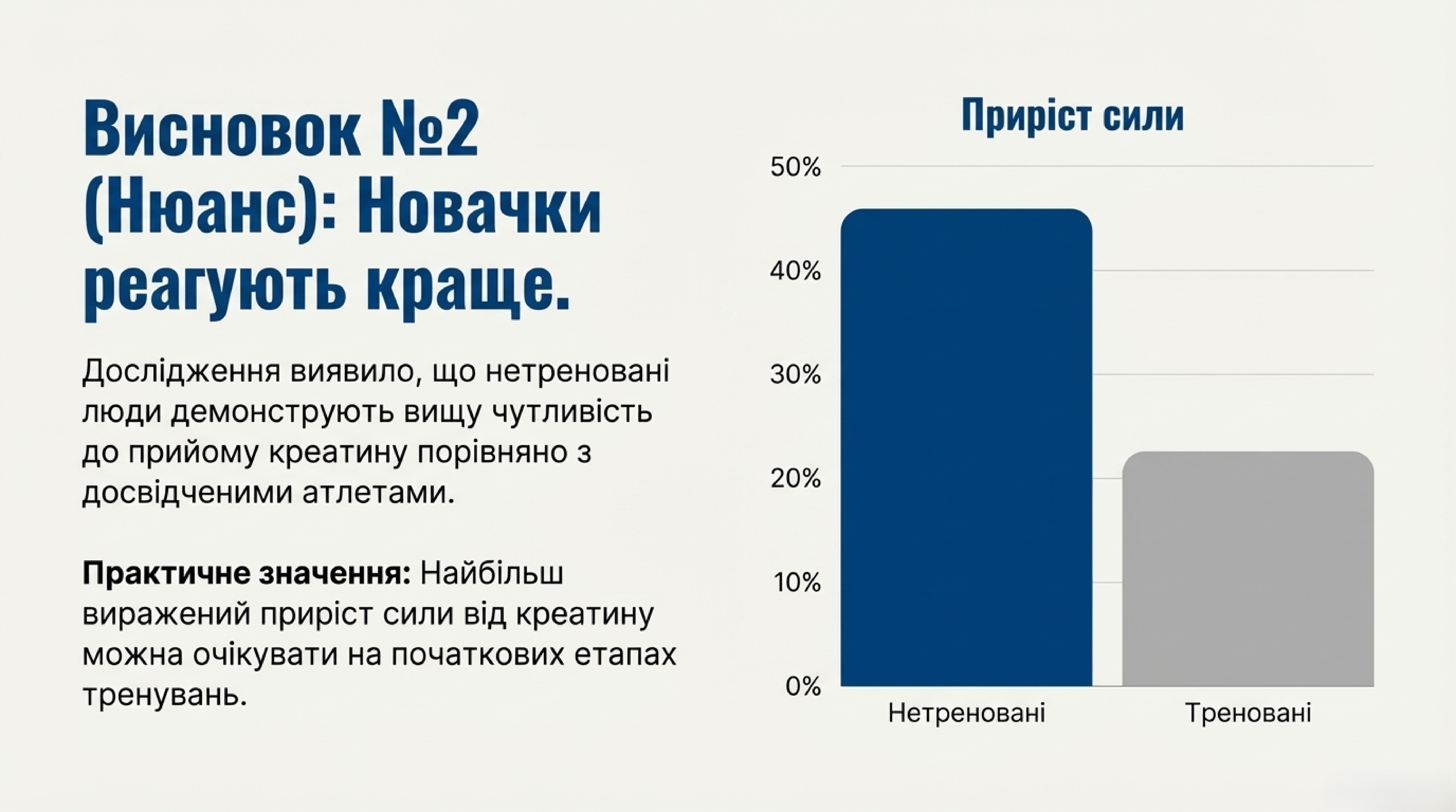 Метааналіз також виявив, що нетреновані люди демонструють вищу сприйнятливість та кращу реакцію на прийом креатину, якщо порівнювати з досвідченими атлетами. Ймовірно, це пов’язано з тим, що в новачків нижчий вихідний рівень і, відповідно, ширше «вікно адаптації», що робить ергогенний ефект креатину більш вираженим. Це важливий висновок для встановлення реалістичних очікувань: для початківців креатин може стати потужним поштовхом, тоді як досвідченим спортсменам для подальшого прогресу потрібно шукати інші шляхи.