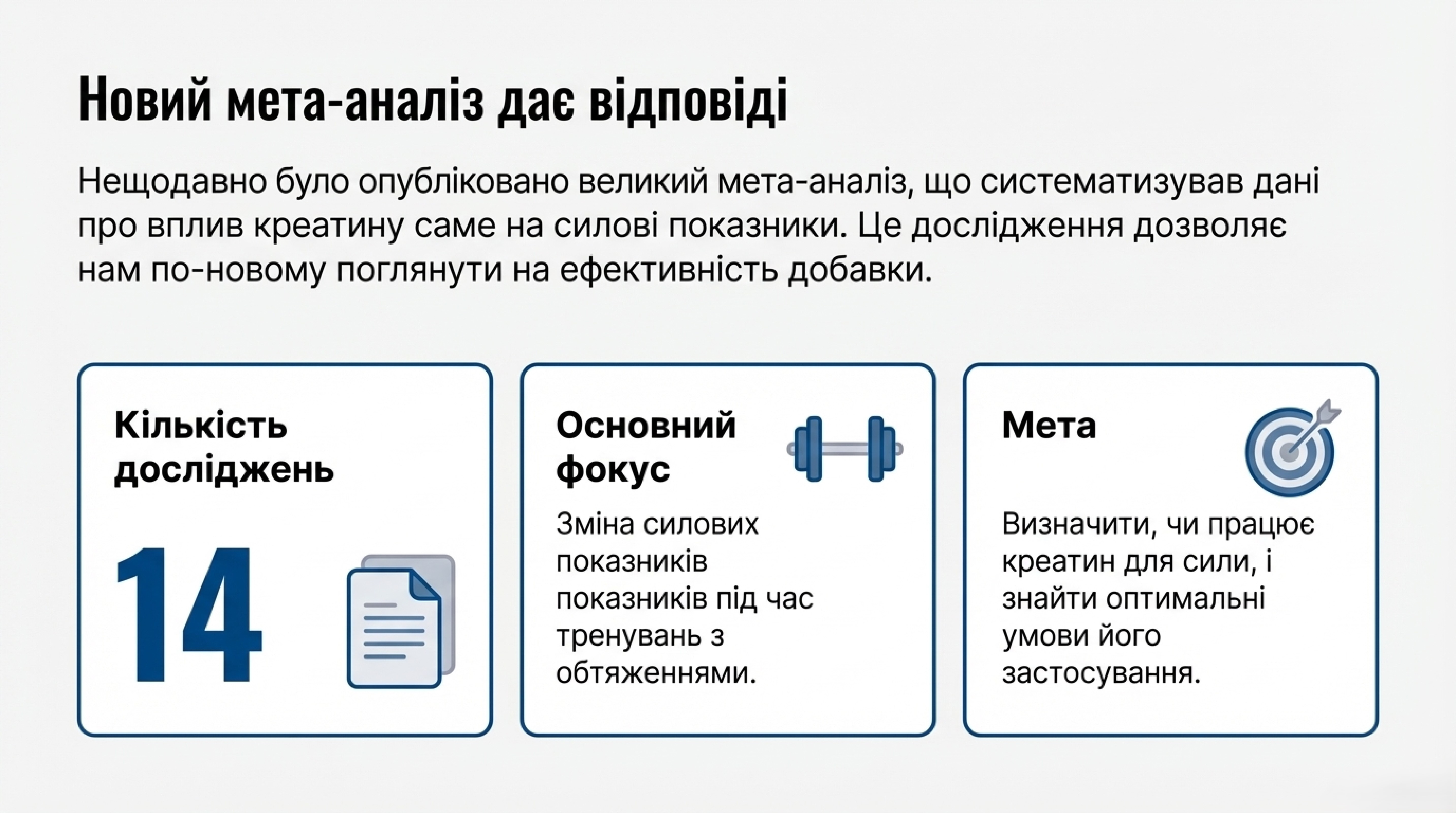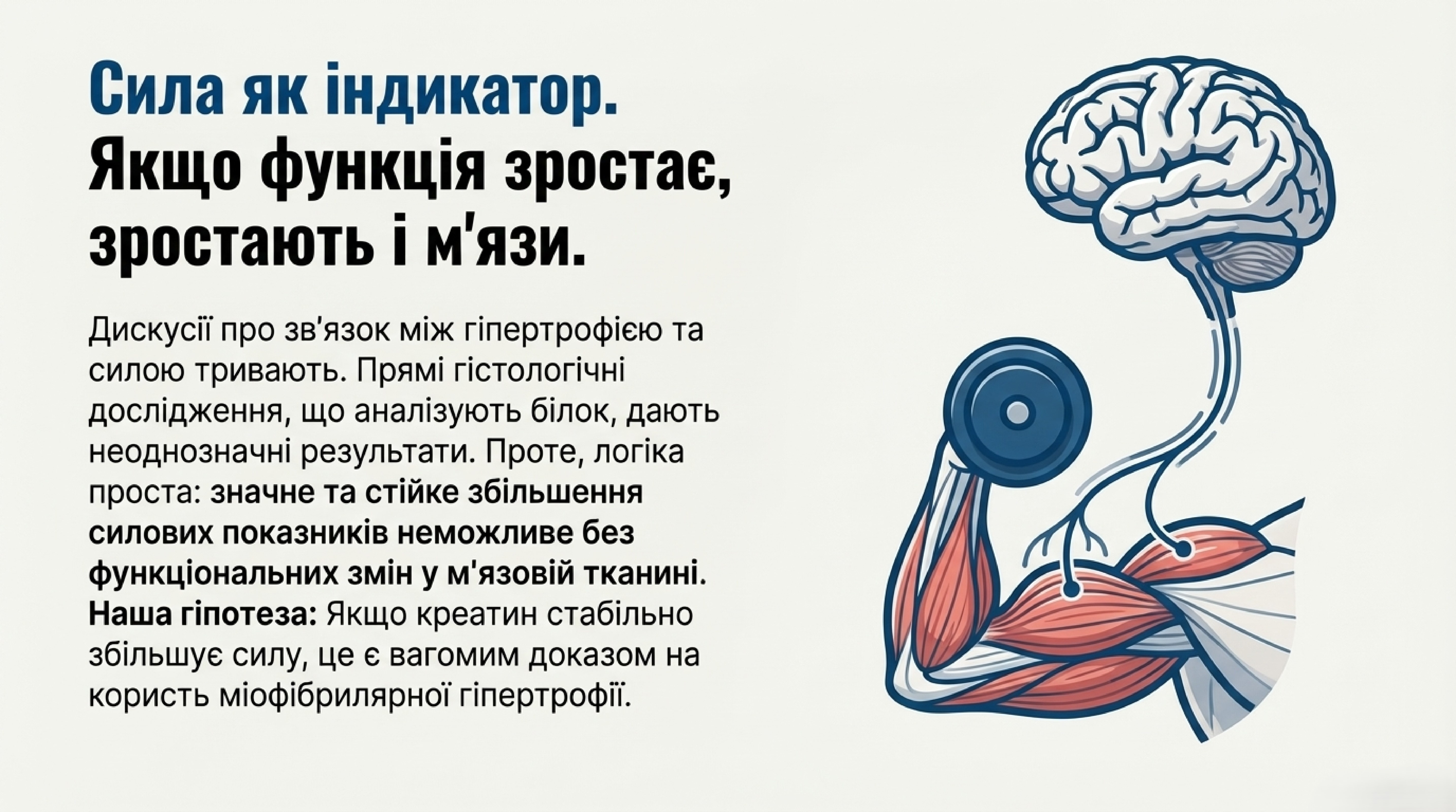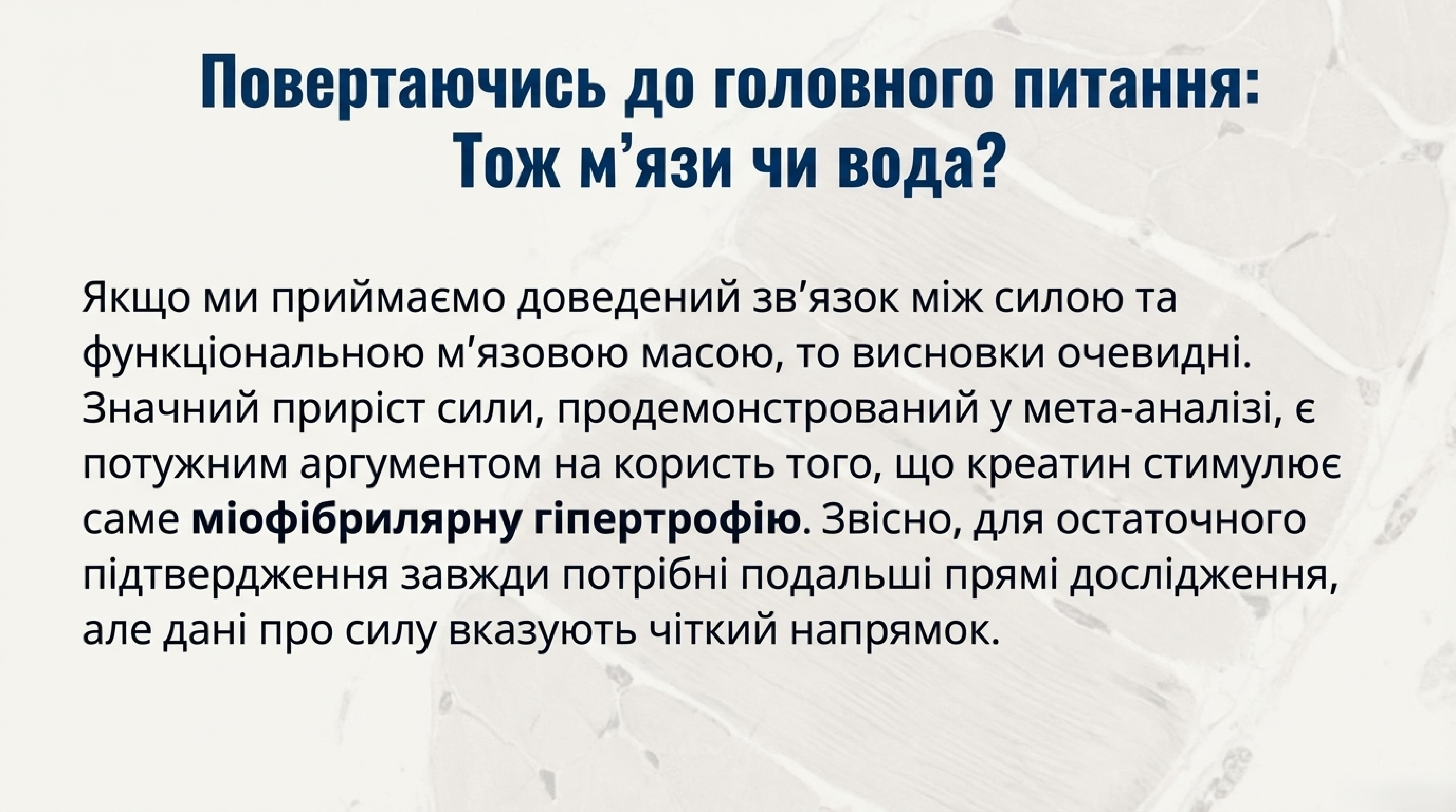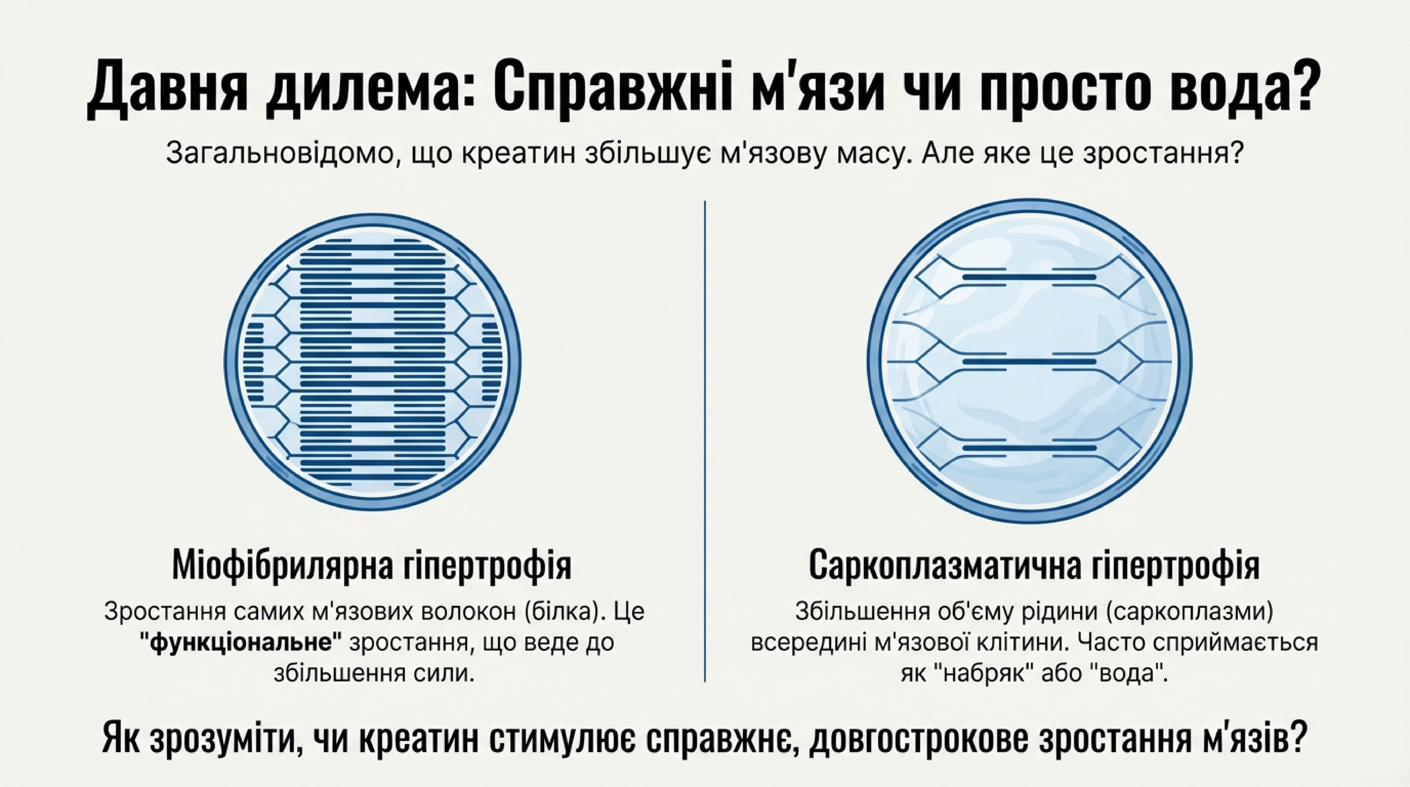 Роками у світі фітнесу тривають суперечки: чи нарощує креатин «справжні», функціональні м’язи (міофібрилярна гіпертрофія), чи тільки затримує воду в клітинах (саркоплазматична гіпертрофія)? Хоча дослідження динаміки м’язового об’єму не дали вичерпних відповідей, новий метааналіз, зосереджений на питомому прирості сили, змальовує значно чіткішу картину. Адже саме сила є прямим свідченням функціональної спроможності м’язових волокон. Ці новітні дані здатні докорінно змінити ваше ставлення до однієї з найпопулярніших добавок у світі.