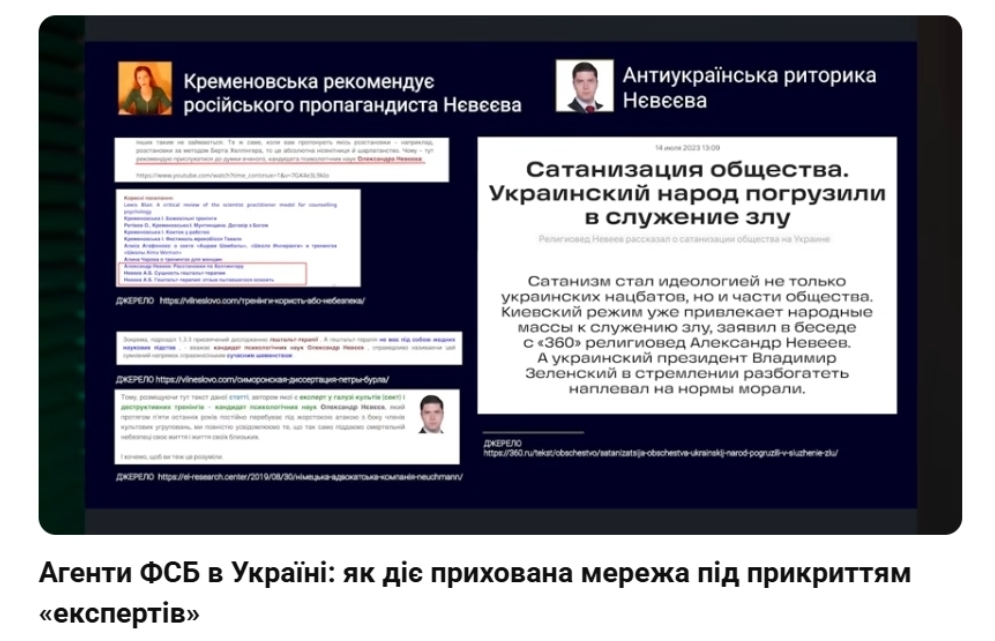 Кременовська неодноразово рекомендувала українській аудиторії слухати рашистського пропагандиста Невеєва як експерта. Що говорить Невеєв про українців? Те, що “український народ занурився у служіння злу…” - ось що каже пропагандист Невеєв, а Кременовська його просуває у нашому інфопросторі.