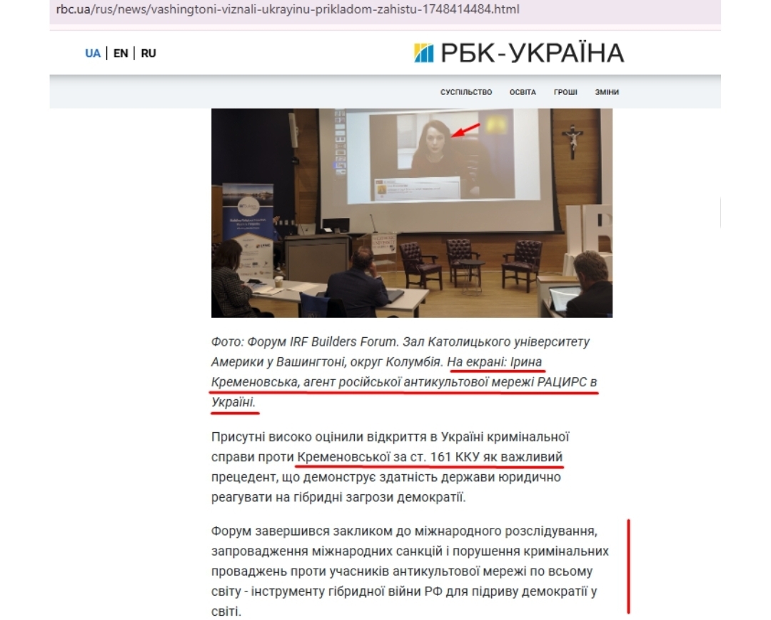 Цитата: “окремо згадано “одіозну українську псевдоекспертку” Ірину Кременовську, яку представники форуму ідентифікували як агентку кремлівської мережі в Україні, що працює безпосередньо на Дворкіна. У Вашингтоні зазначили, що Кременовська фігурує в інформаційно-підривних кампаніях, спрямованих на розхитування релігійної незалежності країни. Діяльність таких осіб учасники форуму назвали серйозною загрозою національній безпеці та демократії”.