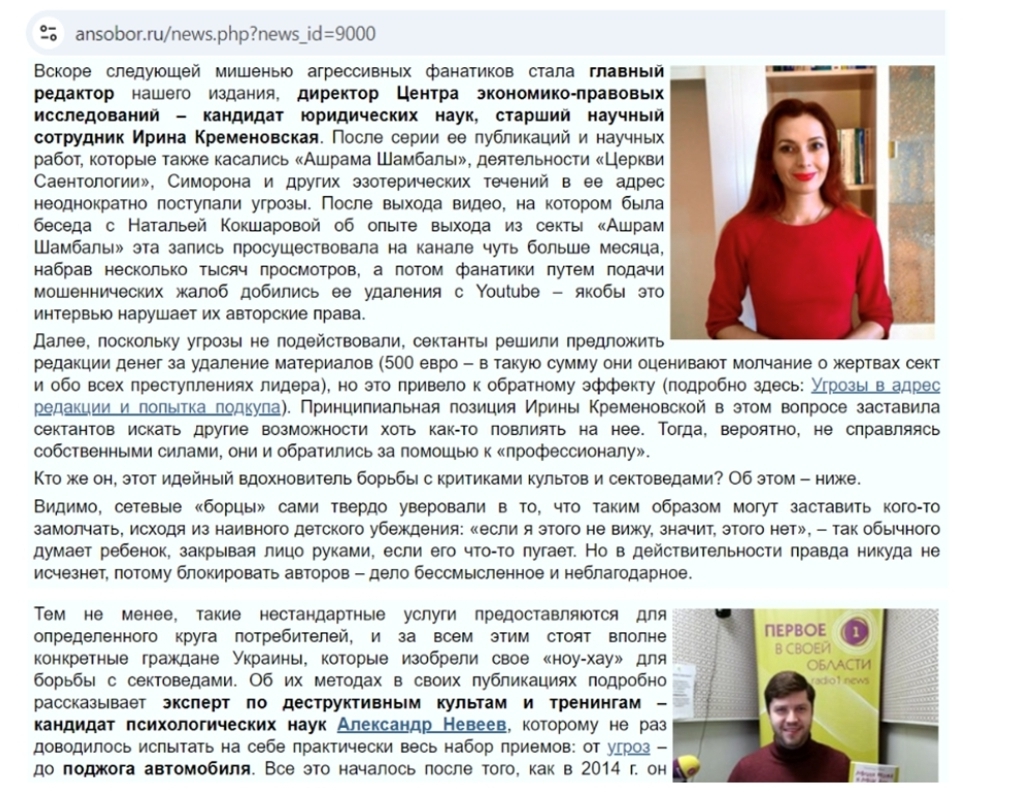 Більше того, антикультовий портал віце-президента РАЦИРС Олександра Новопашина ansobor розмістив копію статті із сайту “Вільне слово”, на якій є фотографії Кременовської та Невеєва і пряме посилання, що веде на український сайт.