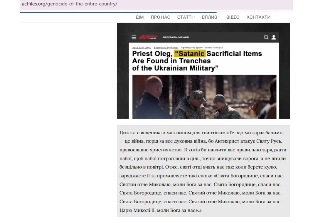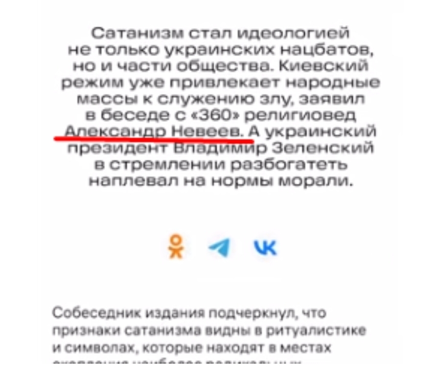 “Сатанізація суспільства. Український народ занурився у служіння злу. Сатанізм став ідеологією не тільки українських нацбатів, але й частини суспільства. Київський режим вже залучає народні маси до служіння злу”.
