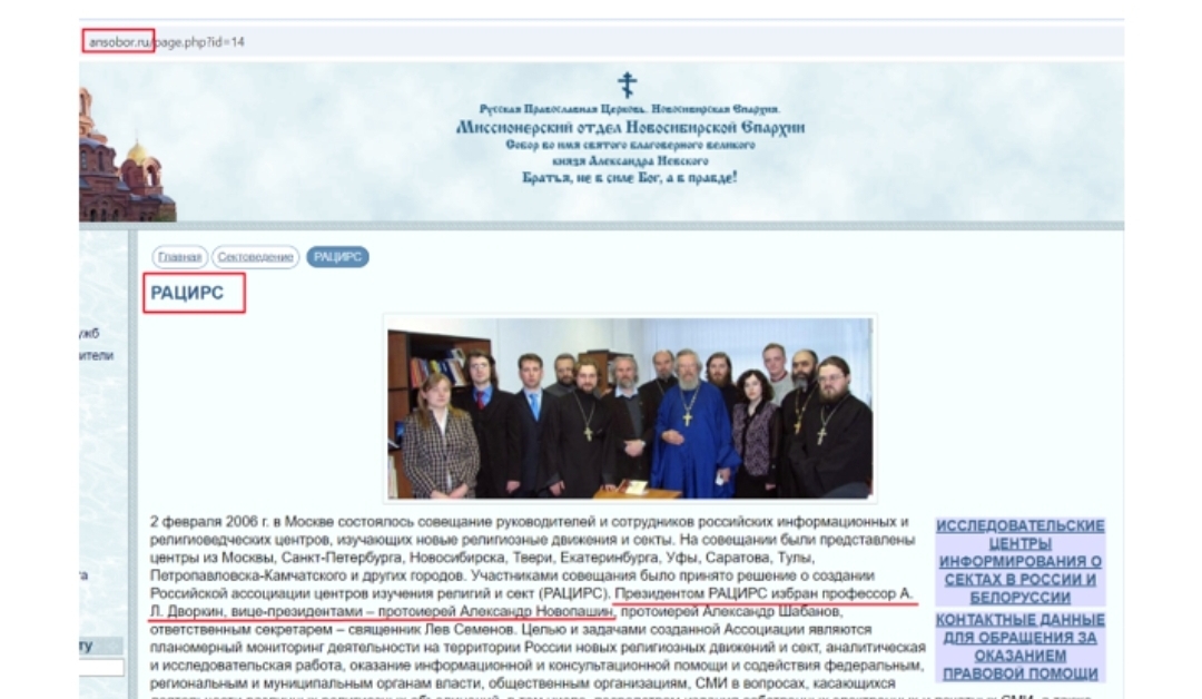 Згадаємо також, що сайт місіонерського відділу Новосибірської єпархії рпц протоієрея Олександра Новопашина - другий за значимістю сайт РАЦИРС. Саме на ньому у 2022 році було вивішено документ під назвою “Довідник для громадян України з організації громадянського опору” Київському маріонетковому уряду. Ця методичка, по суті, є практичним керівництвом із проведення саботажу в Україні під час вторгнення російської армії.