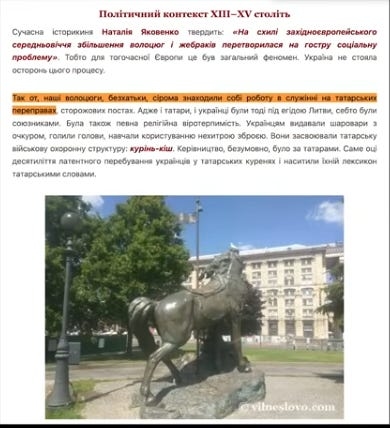цитат зі скрина: “ Окрім татар-козаків, треба припустити, що службу несли в куринях також українці, а саме українські волоцюги.”