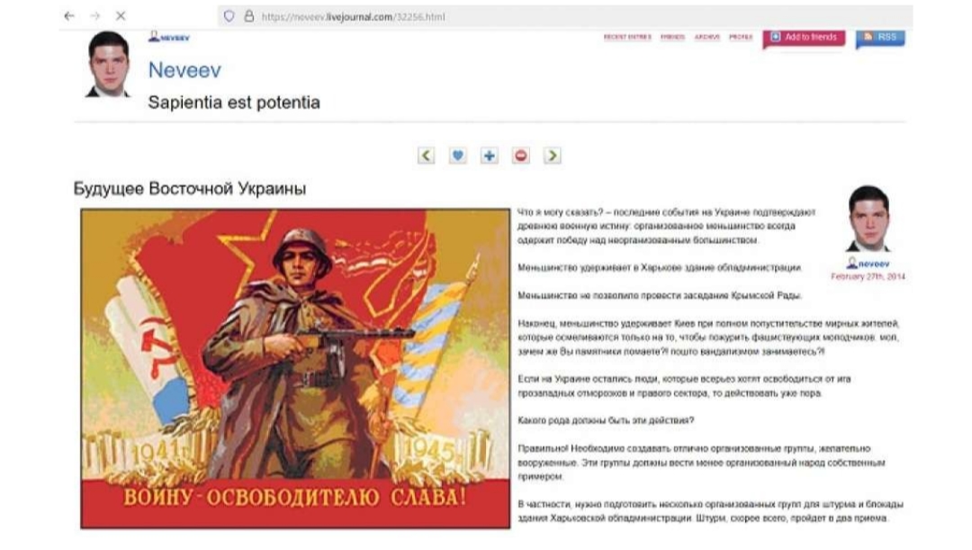 Пост Невєєва із закликом штурмувати Харківську ОДА, який він розмістив у 2014 році у своєму блозі, на який посилається Ірина Кременовська у публікаціях на сайті «Вільне слово»