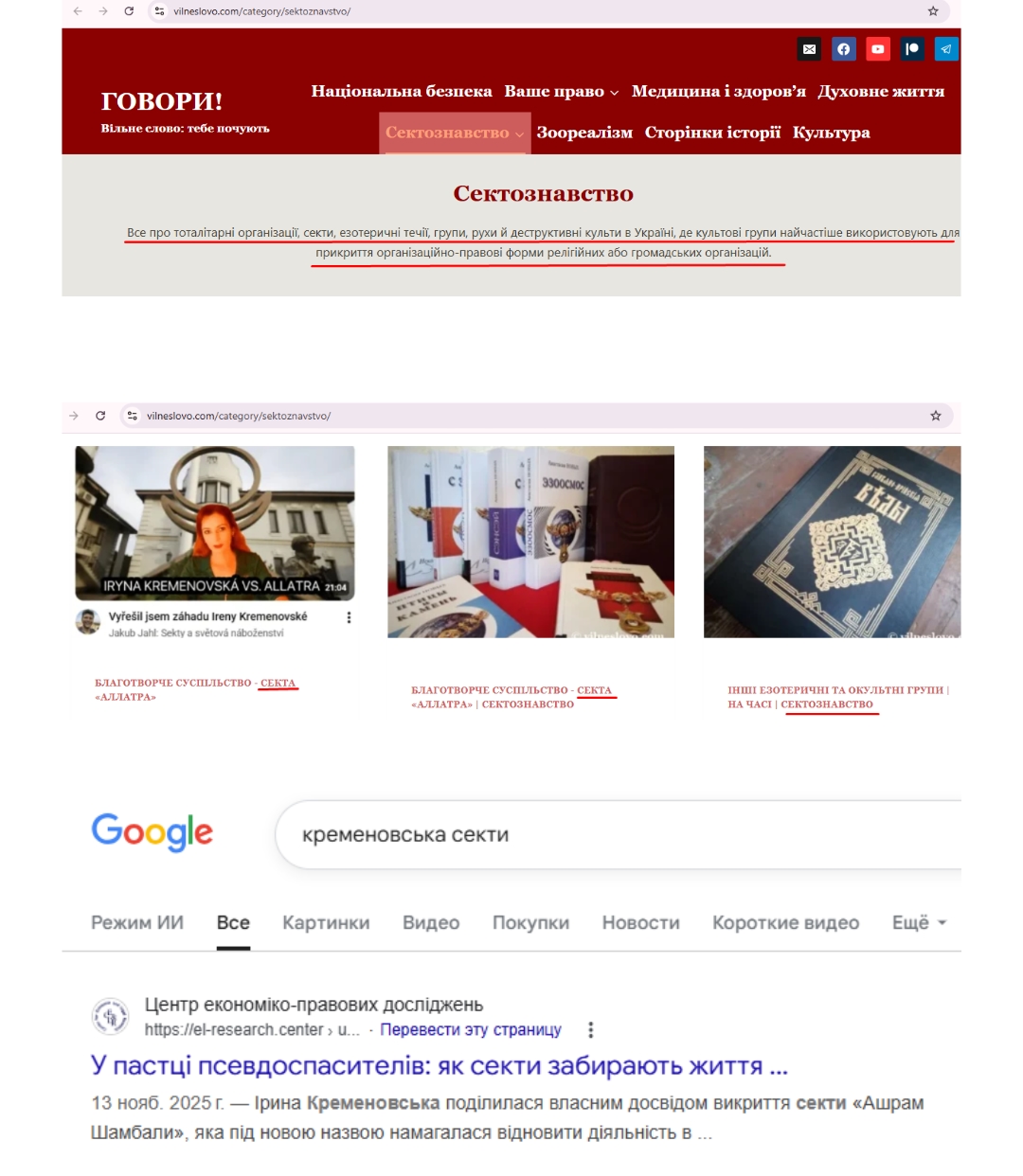 публікує викривальні статті, де використовує терміни “деструктивний культ”, “тоталітарна секта”. Не юридичні, а ідеологічні ярлики, запозичені прямо з російських джерел.