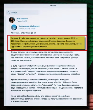 Тож у 2015 році анонімний сайт догхантерів вреді було зламано і в руки зоозахисників потрапила закрита база живодерів. Вони оприлюднили їх закриту переписку, публікували їхні фото, імена. адреси, IP, роботу. Зокрема, до рук зоозахисників потрапив так званий лічильник собак, у якому кожен камрад звітував перед спільниками та кураторами, скільки тварин і як отруїв, застрілUив або вбUв іншим способом. Та матеріали, які прямо свідчать про те, що в них була єдина ідеологія: куратори, методички, завдання та фінансування. І все це йшло з рашки.