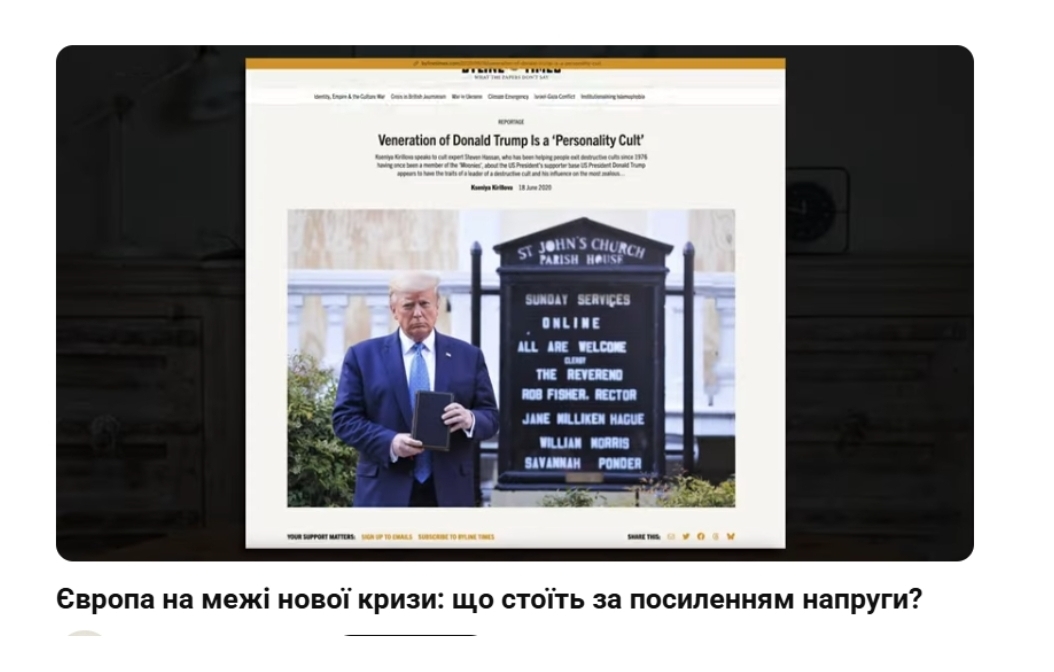 А тепер ще один цікавий факт, який показує, що це невипадковість. Давайте подивимося, що ще 18 червня 2020 року на ресурсі Byline Times вже була опублікована стаття. Про що б ви думали? "Вшанування Дональда #Трамп: культ особистості". І тут ми бачимо, як усе сходиться.