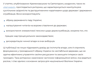 Кременовська та Святогор у своїх публікаціях не лише підривають довіру до інститутів влади, але й сприяють формуванню у громадськості образу України як нестабільної держави, що не здатна ефективно управляти своїми ресурсами та захищати інтереси своїх громадян. Така риторика є важливою частиною інформаційної війни, яка ведеться росією, і стає однією з основних загроз для національної безпеки України.