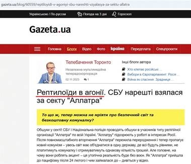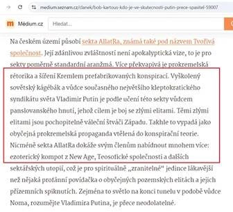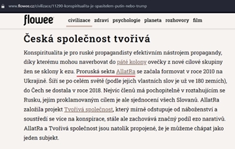«Конспірологія — це ефективний інструмент пропаганди для російських пропагандистів, за допомогою якого вони можуть завербувати в п'яту колону овець з нової цільової групи жінок, схильних до езотерики. Проросійська секта АллатРа почала формуватися в 2010 році в Україні. Вона поширюється по всьому світу (за їхніми словами, вже в 180 країнах), до Чехії дісталася в 2018 році. Найбільше членів, звичайно, в Росії, що розпадається, але її проголошеною метою є об'єднання всіх слов'ян (машинний переклад)».