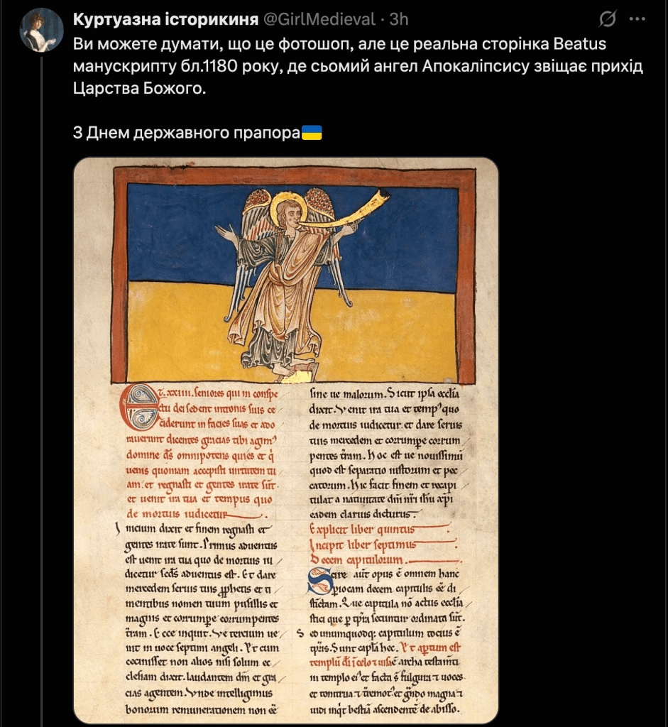 Це те, з чого ходжу хіхікаю останні кілька днів - з кумедного привітання з днем прапора від Куртуазної Історикині вийшов тематичний пост до Дня Державного Прапора і Дня Незалежності🇺🇦 з дрібкою альтернативної історії про Український слід в ілюстраціях з давнього манускрипта Beatus