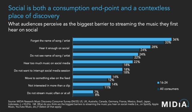 Молодь завжди була першовідкривачами нових популярних артистів, але тепер це вже не так. Підлітки зараз менше пов'язані з музичною сценою, ніж типові 30-річні. Згідно з новим дослідженням MIDIA Research: «16-24-річні рідше, ніж 25-34-річні, знаходили для себе нового улюбленого артиста протягом останнього року — і рідше шукають музики цього артиста далі». Навіть коли вони знаходять пісню, яка їм подобається, в TikTok, вони рідко слухають цього ж артиста на стрімінгу. Те, що відбувається в TikTok, залишається в TikTok. «Розваги стали грою з нульовою сумою», — попереджає MIDIA. «Є мало місця для створення нових просторів для уваги». Колись між музикантом і моделлю, коміком або експертом була велика різниця. Але тепер вони всі змагаються між собою на одній арені за одну й ту саму аудиторію.