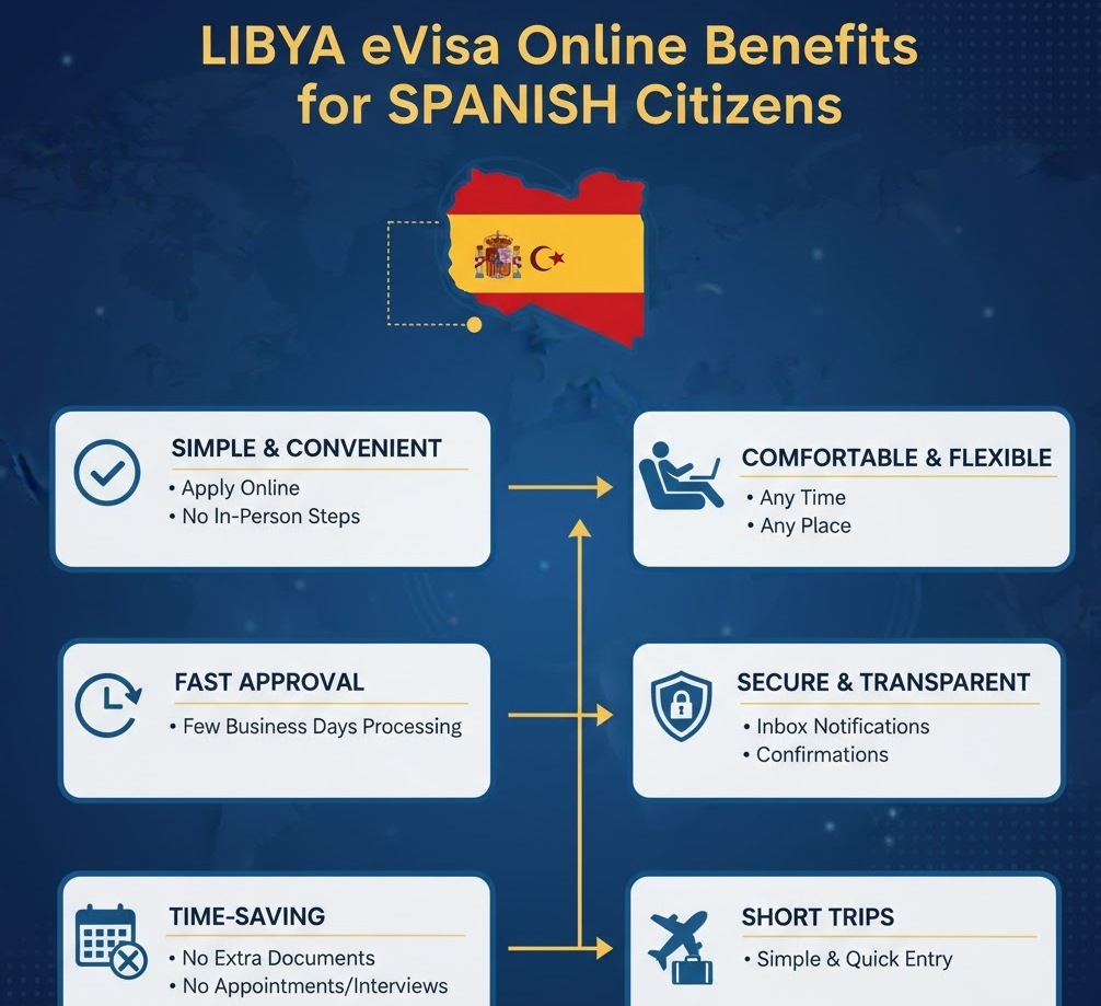 The Libya eVisa for Spanish Citizens offers several advantages compared to traditional visa methods:The eVisa to Libya for Spanish Citizens provides numerous benefits over traditional travel visas: