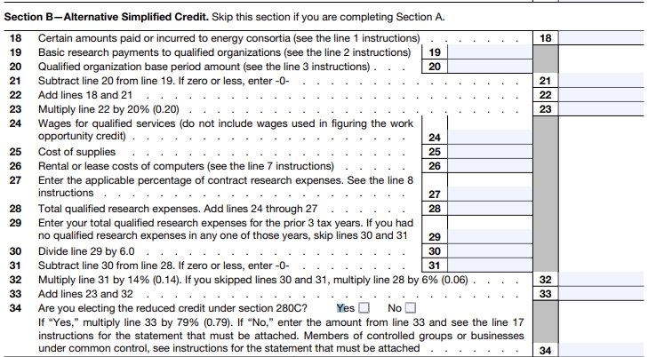 Use Form 6765 Part II to elect ASC. ASC often reduces bookkeeping complexity but can change credit size — model both methods to see which yields a better result.