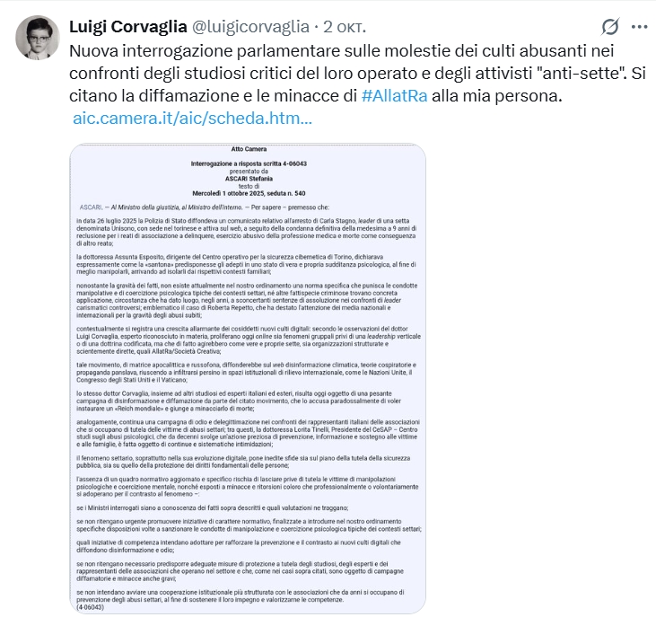 Але давайте по черзі. Чому Луїджі Корвалья так активізувався і навіщо було подано цей запит? Відповідаю: щоб відбілити та виправдати мережу цих «експертів із сект», які всі між собою пов'язані. Вони нападають на одні й ті самі організації, говорять однаковими фразами, переслідують одні й ті ж цілі. Їхня справжня мета — руйнування демократії шляхом просування законів, які обмежують права і свободи людей. Вони хочуть нав'язати в Європі режим, подібний до того, який зараз, за сприяння копрофіла Олександра Дворкіна, встановлений у Росії. Вони хочуть обмежити всі права, забрати у людей доступ до інтернету, до соцмереж і влаштувати Північну Корею 2.0, де ні в кого не буде ні прав, ні свобод, ні можливості вільно висловлювати свою думку.