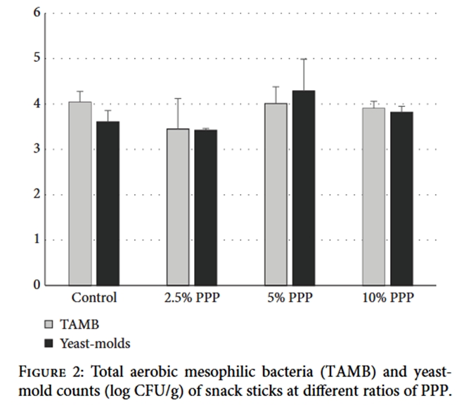 Кількість Enterobacteriaceae (< 1 log КУО/г) не була виявлена в м’ясних паличках, що містили різне співвідношення ПШГ. Можливо, Enterobacteriaceae втратили свою життєздатність під час виробництва паличок-снеків, оскільки вони дуже чутливі до високої температури та низьких значень активності води (< 0,96) [46]. Пагліаруло та ін. [47] продемонстрували інгібуючий вплив ПШГ на ріст та виживання бактерій Staphylococcus aureus та Escherichia coli, які зазвичай беруть участь у харчових захворюваннях. Також повідомлялося, що не було дозозалежного впливу ПШГ на кількість Enterobacteriaceae у варених свинячих ковбасах (тобто у досліджені не було помічено різниці впливу на бактерії різних концентрацій ПШГ у м’ясному продукті) [48].