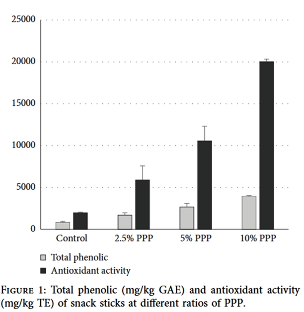 У цьому дослідженні використовувався ШГ як побічний продукт виробництва гранатового соку для надання функціональних властивостей м’ясним паличкам для снеків. Значення pH знижувалося, загальна фенольна та антиоксидантна активність збільшувалася, а колір ставав червонішим (вище значення a∗) зі збільшенням співвідношення ШГ у паличках для снеків. Використання ШГ до 2,5% мало такий самий вплив на текстурні та сенсорні властивості паличок для снеків, як і в контрольній групі. Виробництво м’ясних паличок для снеків без ШГ, безсумнівно, призвело б до кращої текстурної та сенсорної якості кінцевого продукту, але, ймовірно, було б економічно невигідним для переробників. Було зроблено висновок, що при використанні ШГ до 2,5% фізико-хімічні властивості паличок для снеків покращувалися б, ринкова вартість знижувалася б, і водночас вони збагачувалися б антиоксидантами, що робило б їх продуктом корисним для здоров’я. Новизною цього дослідження є застосування ШГ у м’ясних снекових продуктах, що не було широко досліджено в попередніх дослідженнях. На відміну від інших рослинних добавок, які зазвичай використовуються для збагачення антиоксидантами, ПШГ (порошок шкірки граната) пропонує подвійну перевагу: покращення фізико-хімічних властивостей та сприяння зменшенню відходів та економічній життєздатності завдяки використанню побічного продукту агропромисловості [1].