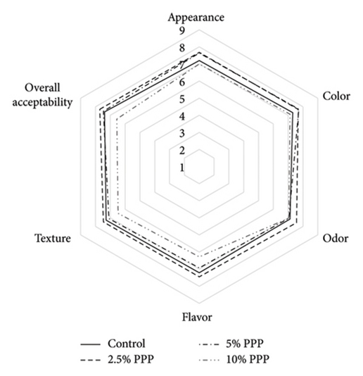 Крім того, загальні оцінки прийнятності паличок, виготовлених з 2,5% та 5% ПШГ, були значно вищими, ніж у паличок з 10% ПШГ, та подібними до показників контрольної групи [1]. Це можна розглянути на пелюстковій діаграмі на рисунку 5.