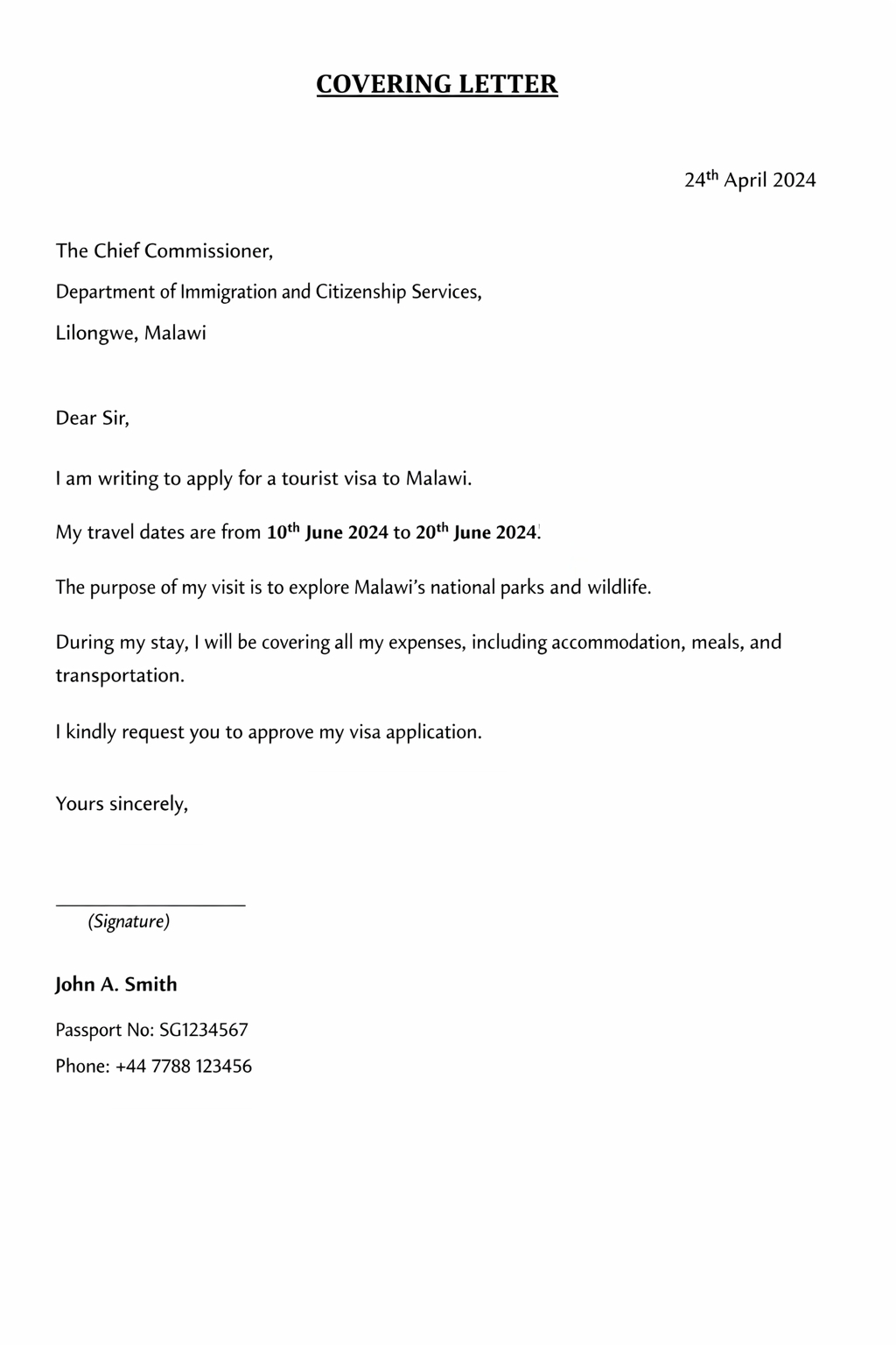 The Malawian Department of Immigration requires a signed covering letter for almost every visa category. This letter must be addressed to the Chief Commissioner for Immigration and Citizenship Services. It should clearly state your arrival/departure dates, the nature of your visit, and who will be responsible for your expenses.
