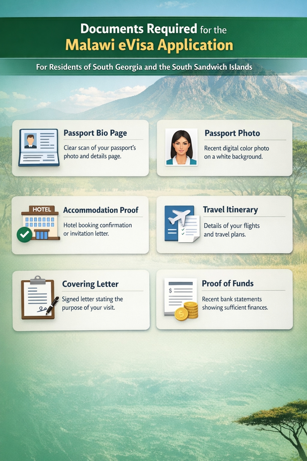 To ensure a smooth application, residents of South Georgia and the South Sandwich Islands should have the following digital documents required for Malawi eVisa application: