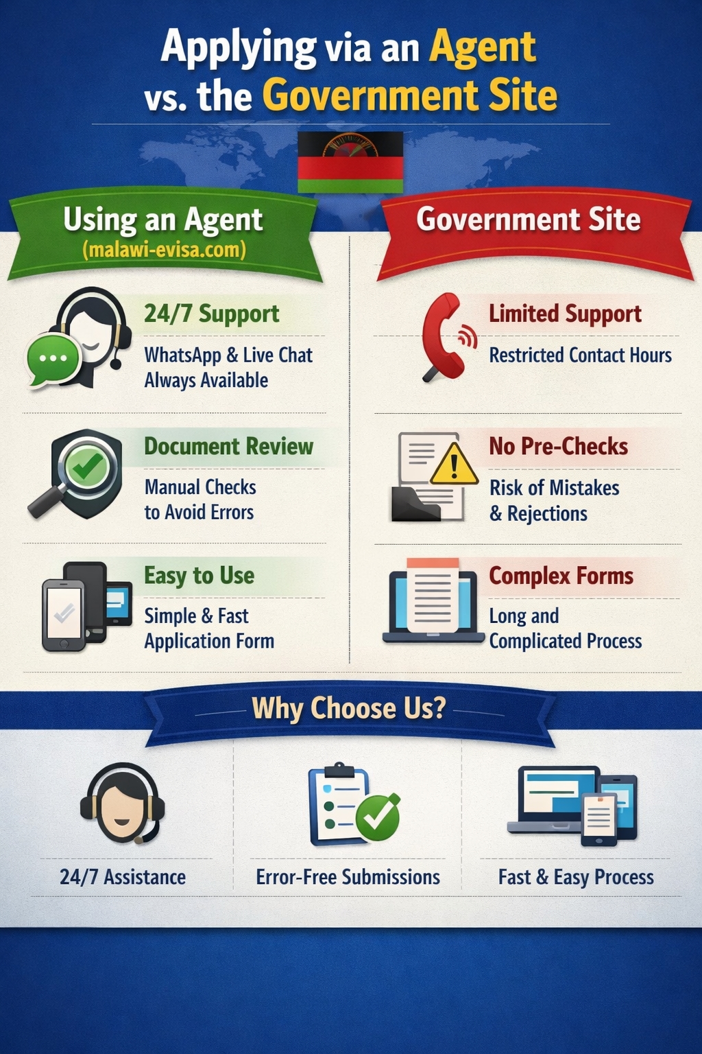 While the government site is the primary portal, many travelers from Suriname prefer using a professional agent like malawi-evisa.com. The key differences include: