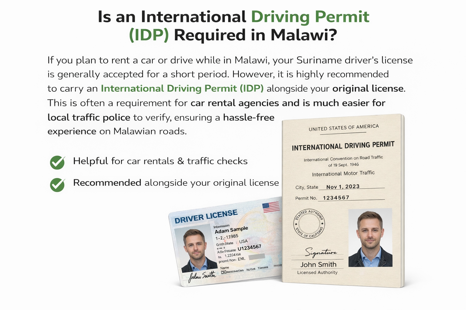 If you plan to rent a car or drive while in Malawi, your Suriname driver’s license is generally accepted for a short period. However, it is highly recommended to carry an International Driving Permit (IDP) alongside your original license. This is often a requirement for car rental agencies and is much easier for local traffic police to verify, ensuring a hassle-free experience on Malawian roads.